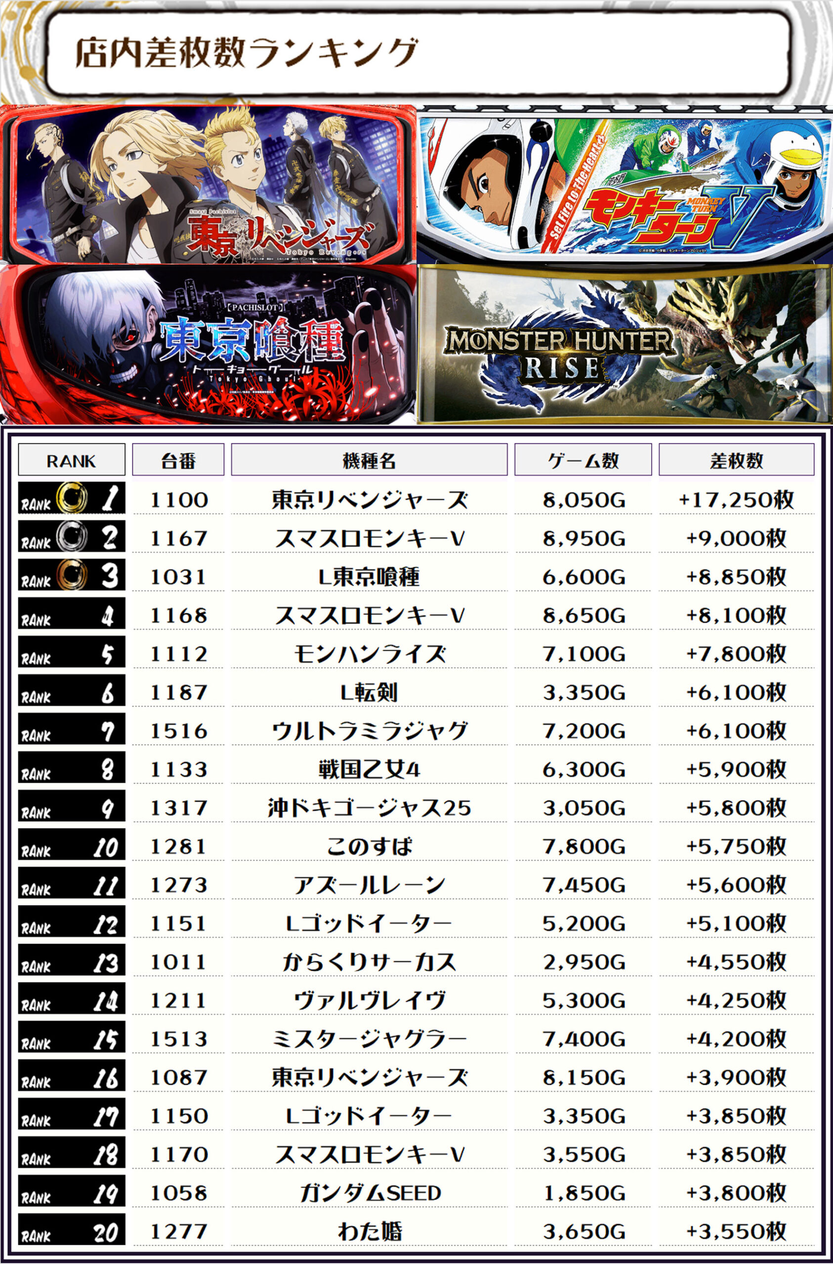 この日、全体の差枚トップに輝いたのは【東京リベンジャーズ・1100番台】で+17,250枚‼️