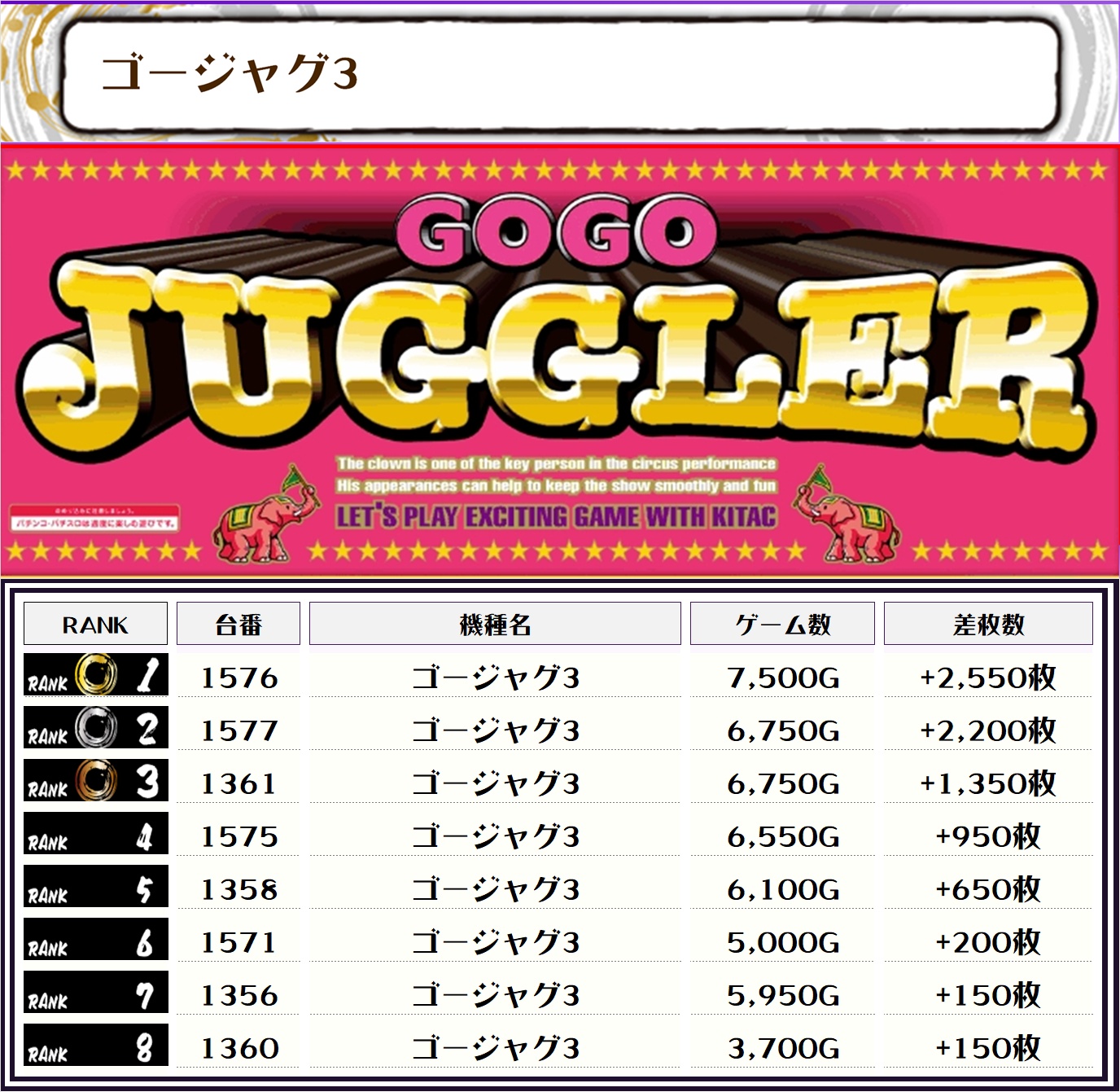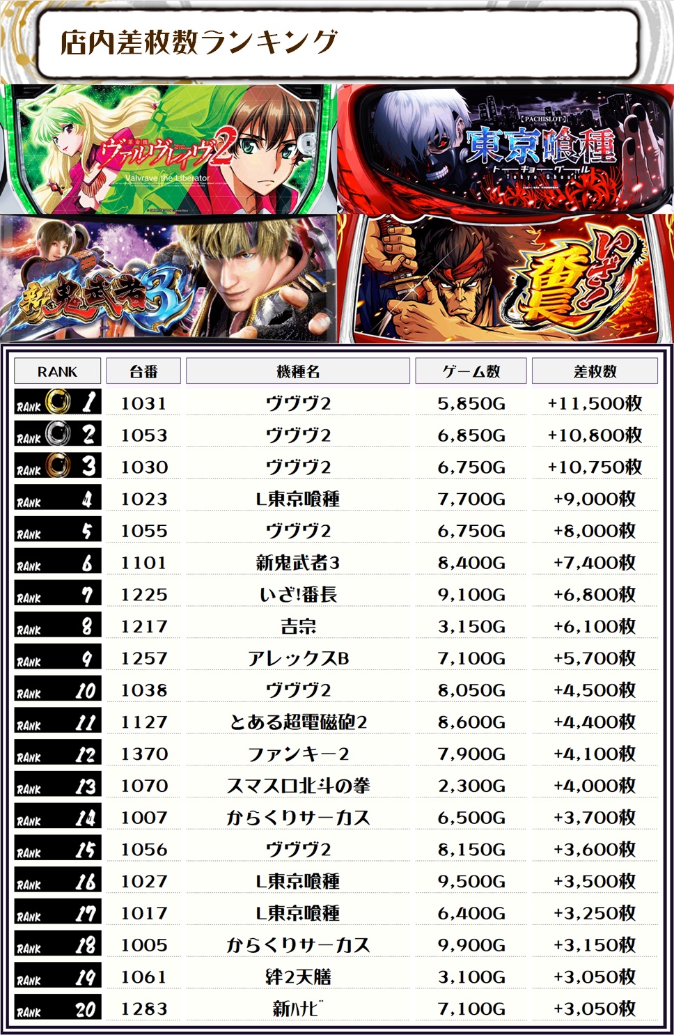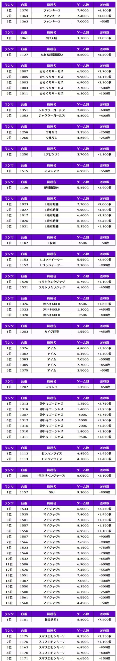 また、この日の店内全台の差枚数ランキングはこちらになります
