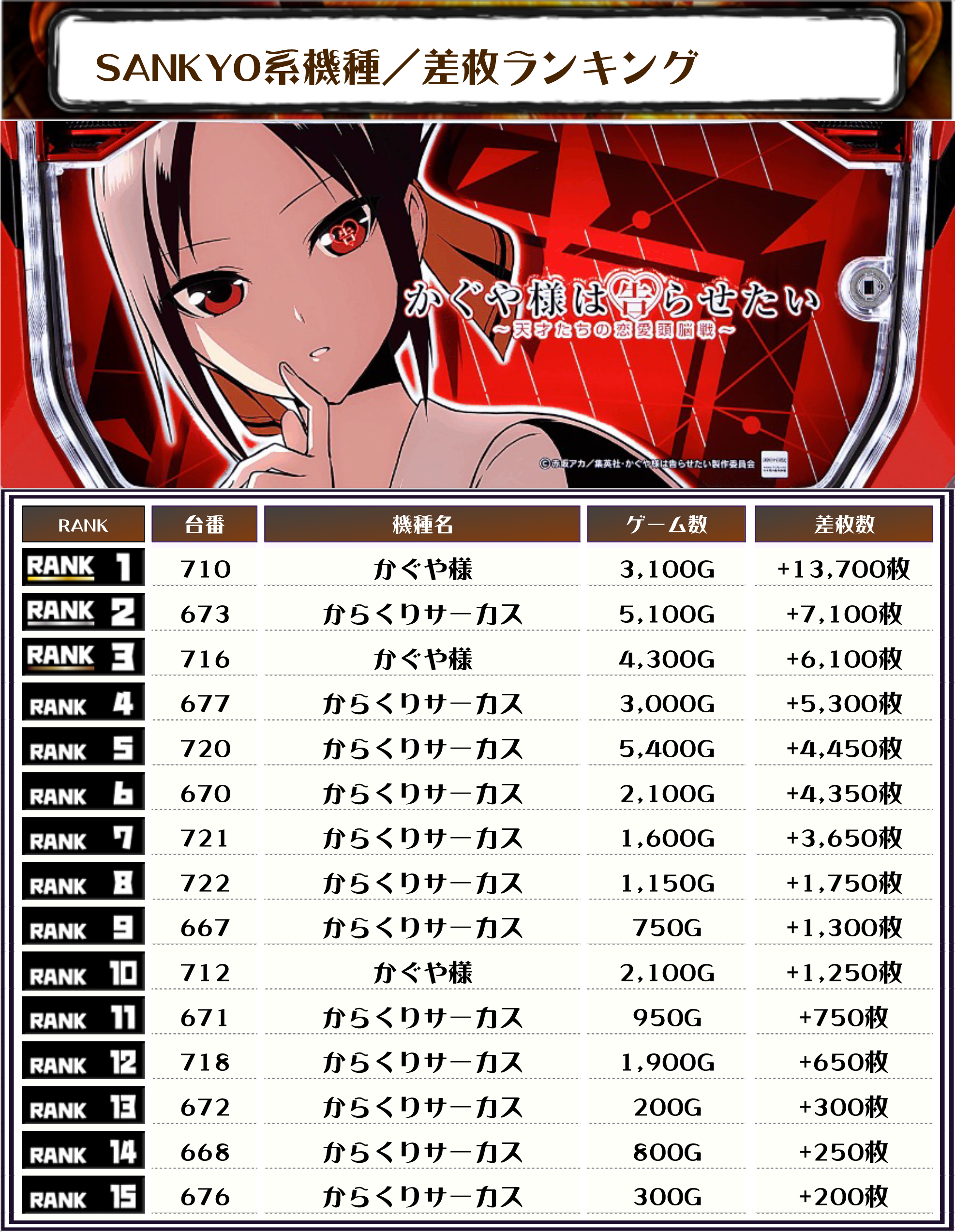 からくりサーカスがランキングの半数以上を占める結果となっていてメイン機種の力強さを物語っていますが、トップ3の内2台が少数台のかぐや様だったことにも驚きです‼️