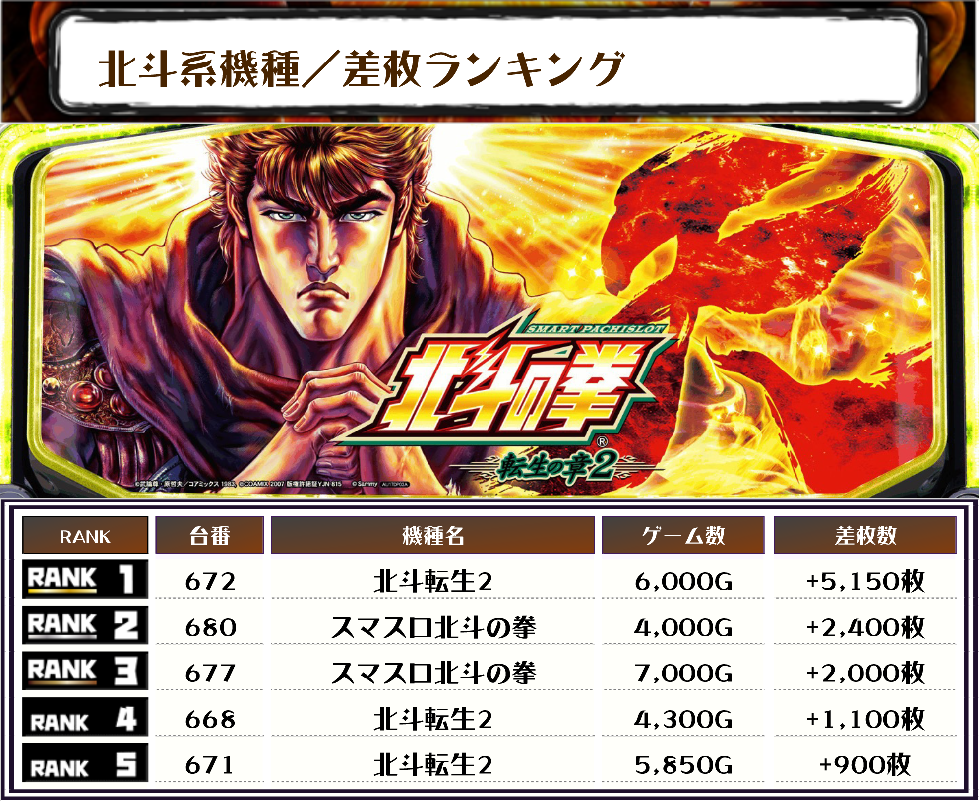また、2位には【スマスロ北斗の拳・680番台】の+2,400枚、そして3位にも【スマスロ北斗の拳・677番台】の+2,000枚がランクインしました🏆