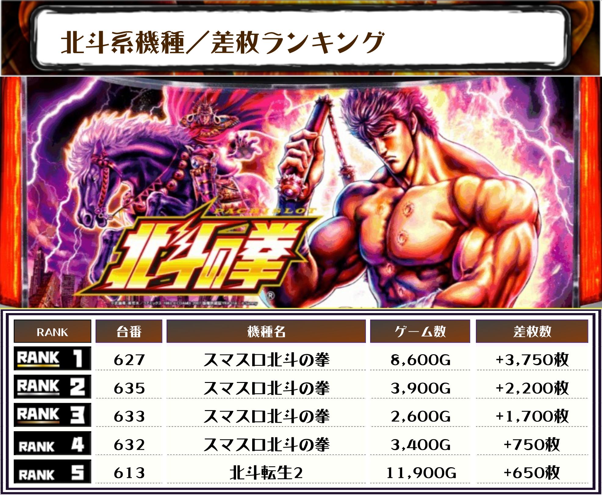 また、2位にも【スマスロ北斗の拳・635番台】の+2,200枚、そして3位にも【スマスロ北斗の拳・633番台】の+1,700枚がランクインしました🏆