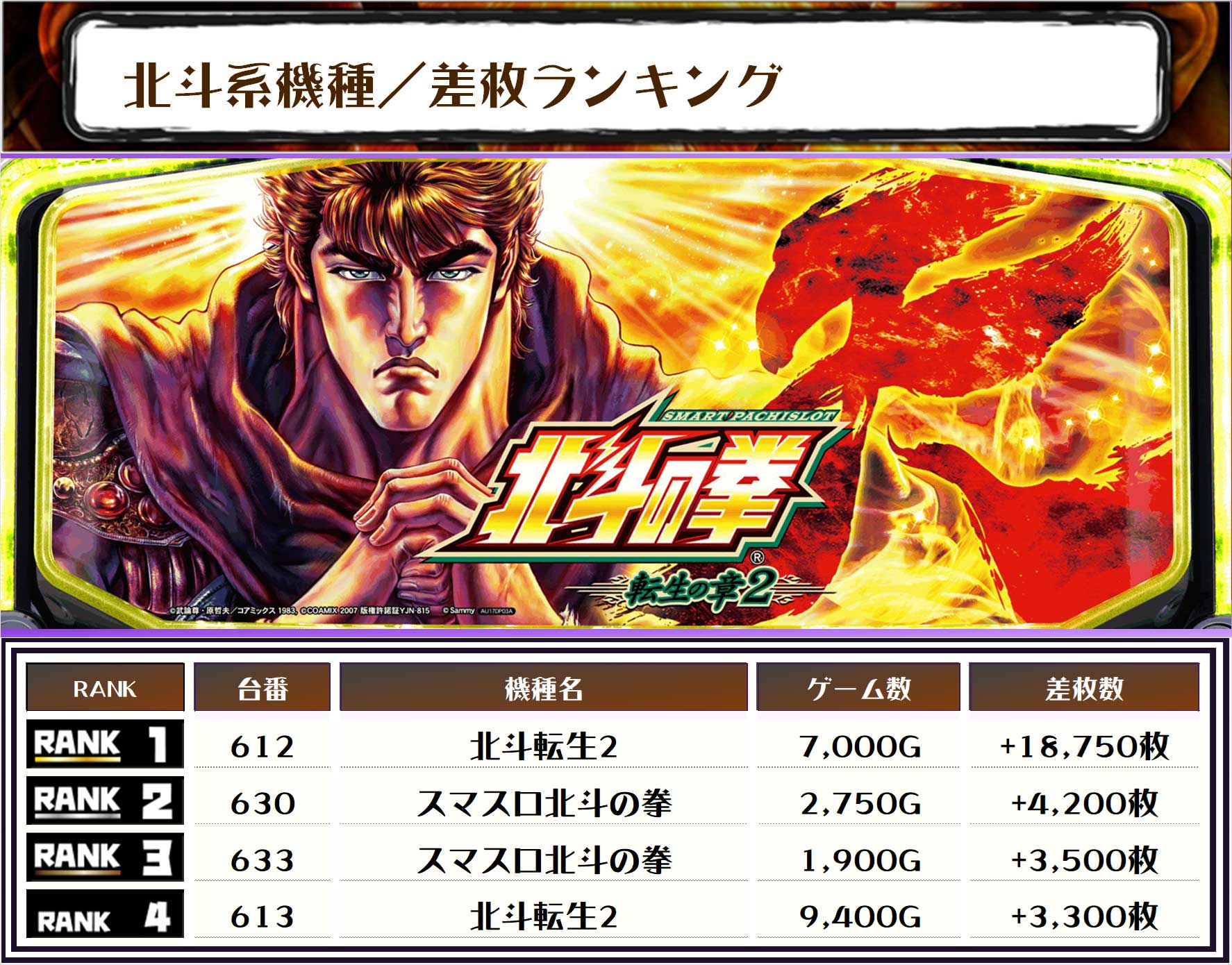 2位には【スマスロ北斗の拳・630番台】の+4,200枚、そして3位にも同じく【スマスロ北斗の拳・633番台】の+3,500枚がランクインしました🏆