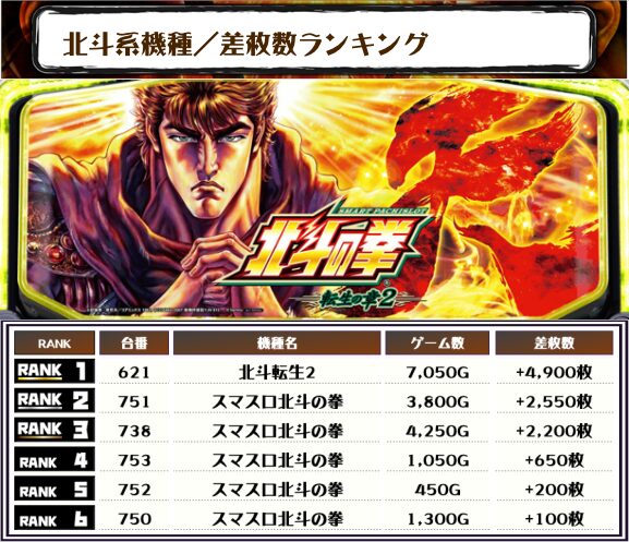 2位には【スマスロ北斗の拳・751番台】の+2,550枚、そして3位にも同じく【スマスロ北斗の拳・738番台】の+2,200枚がランクインしました🏆