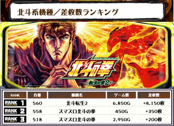 また、2位には【スマスロ北斗の拳・558番台】の+350枚がランクイン、そして3位にも【スマスロ北斗の拳・518番台】の+200枚がランクインしました🏆