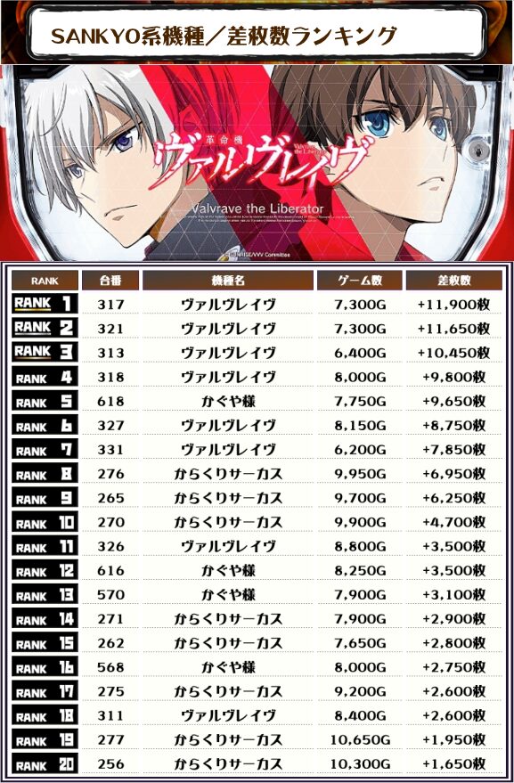 毎回台数が多いヴァルヴレイヴ&からくりサーカスがランキングを占める割合が多いので、やはりこの2機種を攻めるのが王道なのでしょうか…🤔