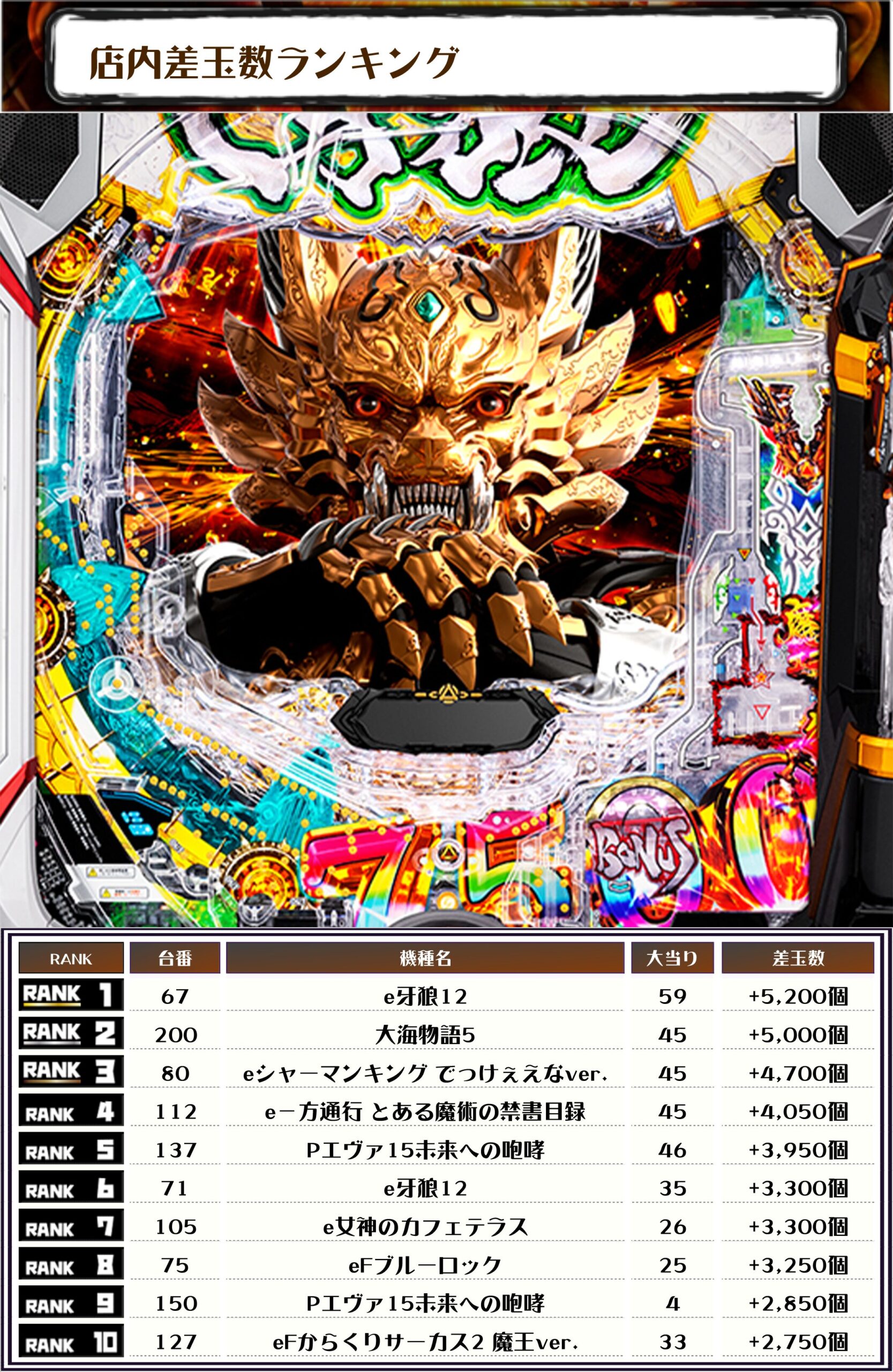 ということで、この日のトップ出玉は【e牙狼12・67番台】の+5,200発っ👑