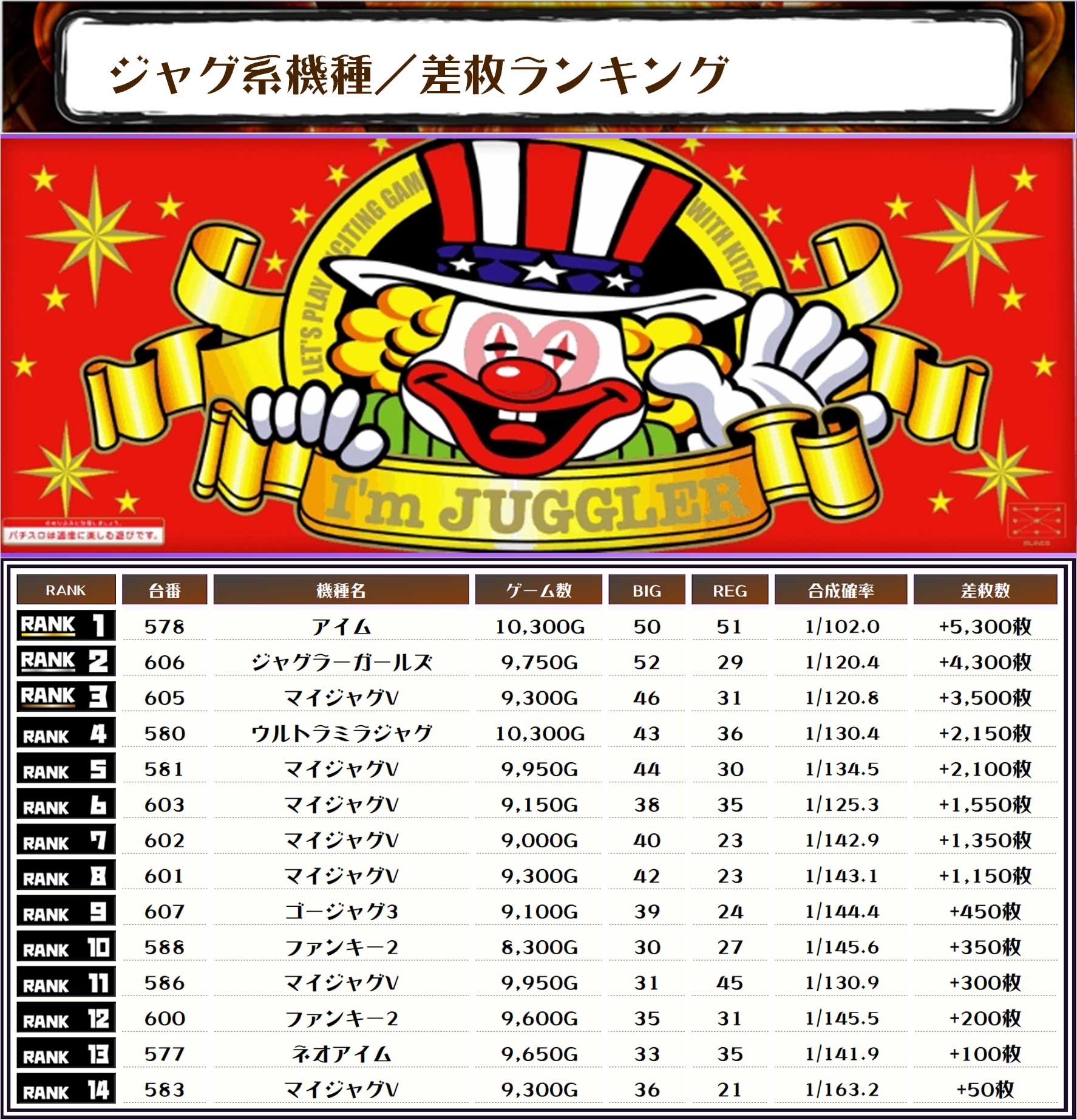 また、2位には【ジャグラーガールズ・606番台】の+4,300枚、そして3位には【マイジャグV・605番台】の+3,500枚がランクインっ‼️