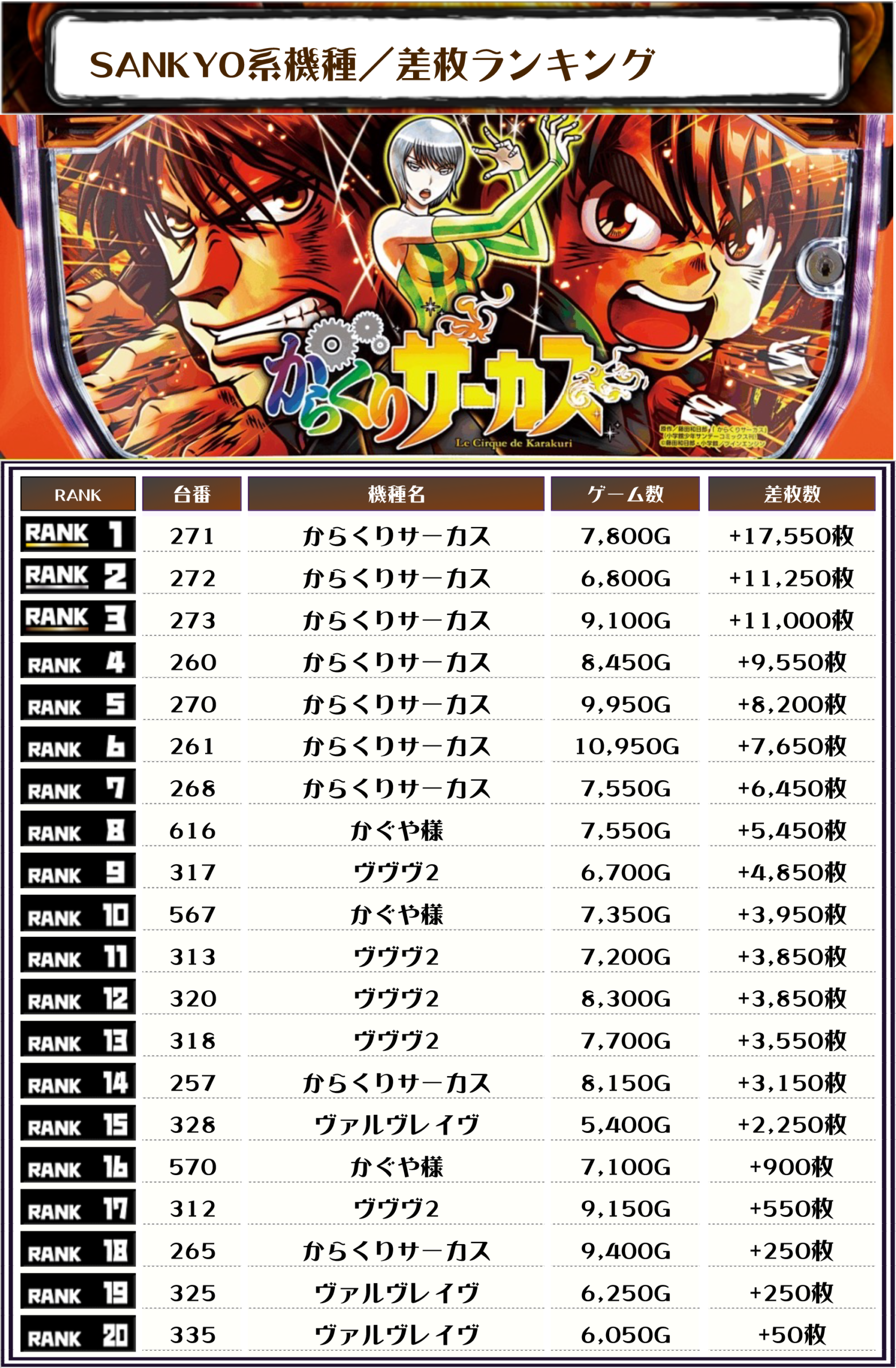 この日のトップ差枚は【からくりサーカス・271番台】で+17,550枚‼️