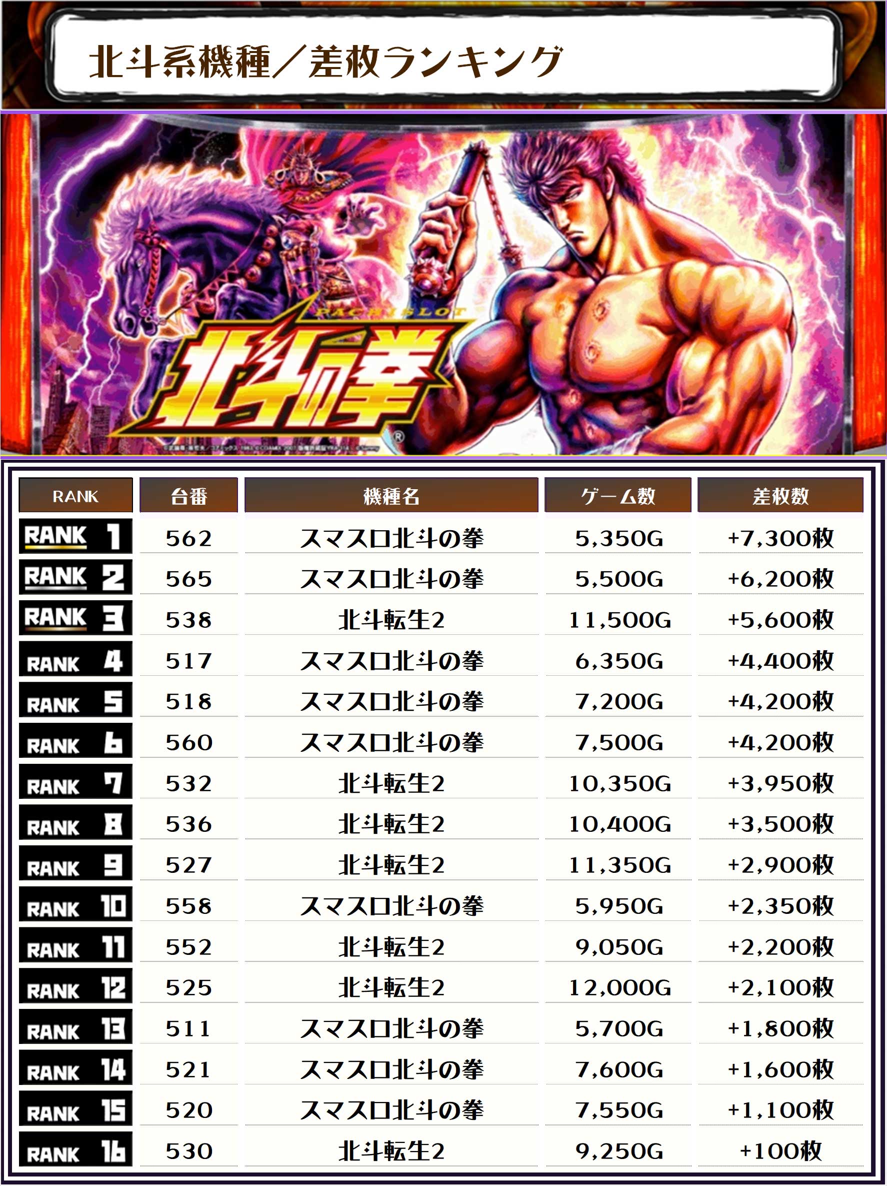 また、2位にも同じく【スマスロ北斗の拳・565番台】の+6,200枚、そして3位には【北斗転生2・538番台】の+5,600枚がランクインしました🏆