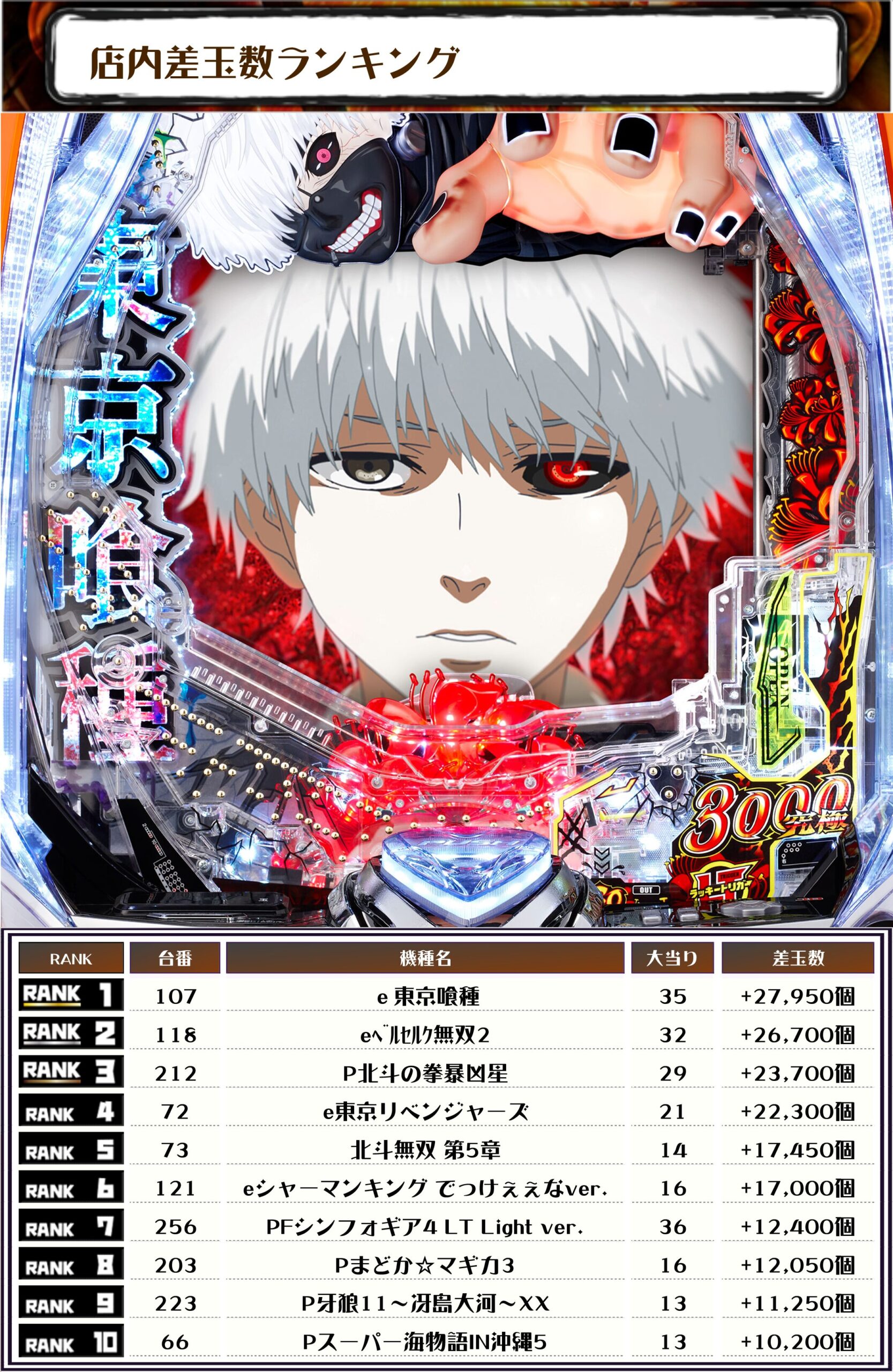 ということで、この日のトップ出玉は【e東京喰種・107番台】の+27,950発っ👑