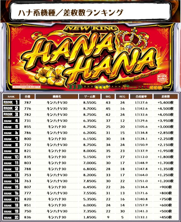 また、2位にも【キンハナV30・776番台】の+4,500枚、3位にも【キンハナV30・782番台】の+4,050枚がランクイン✨️