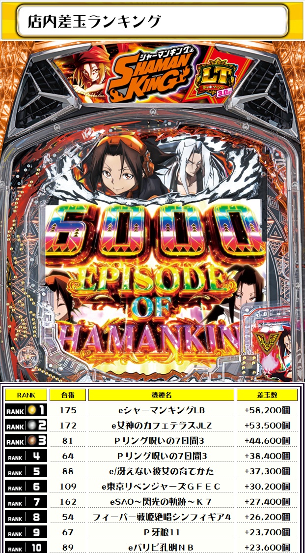 この日、全体の差枚トップに輝いたのは【シャーマンキング・175番台】の+58,200個‼️その他の機種からも大量獲得台が多数出現して、TOP10はすべて2万発オーバーという好結果に!