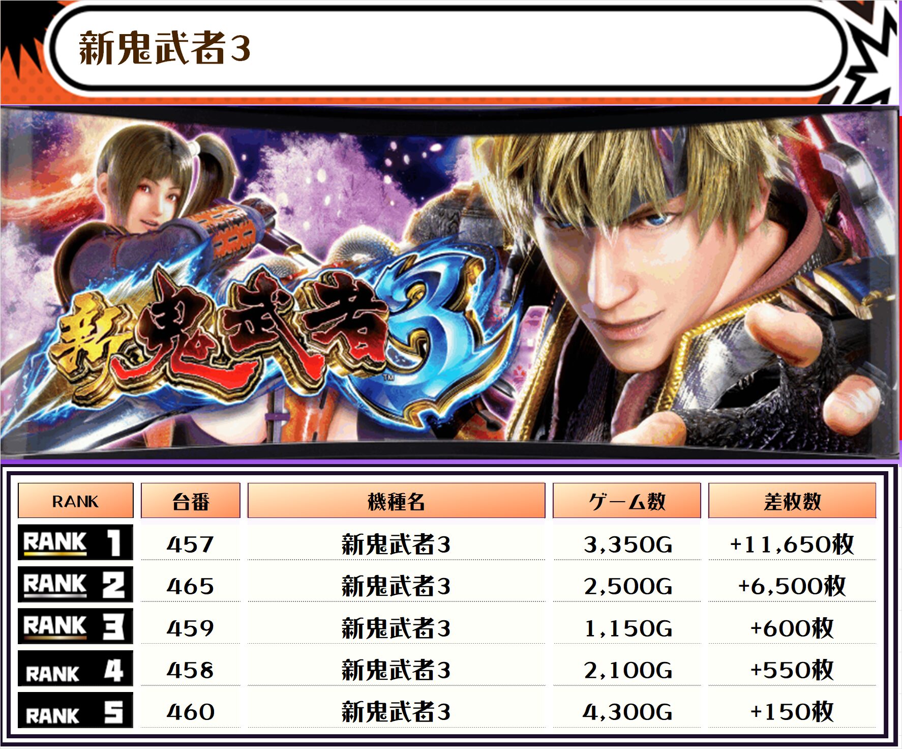 この日の全体差枚トップは【新鬼武者3・457番台】の+11,650枚っ🎉
