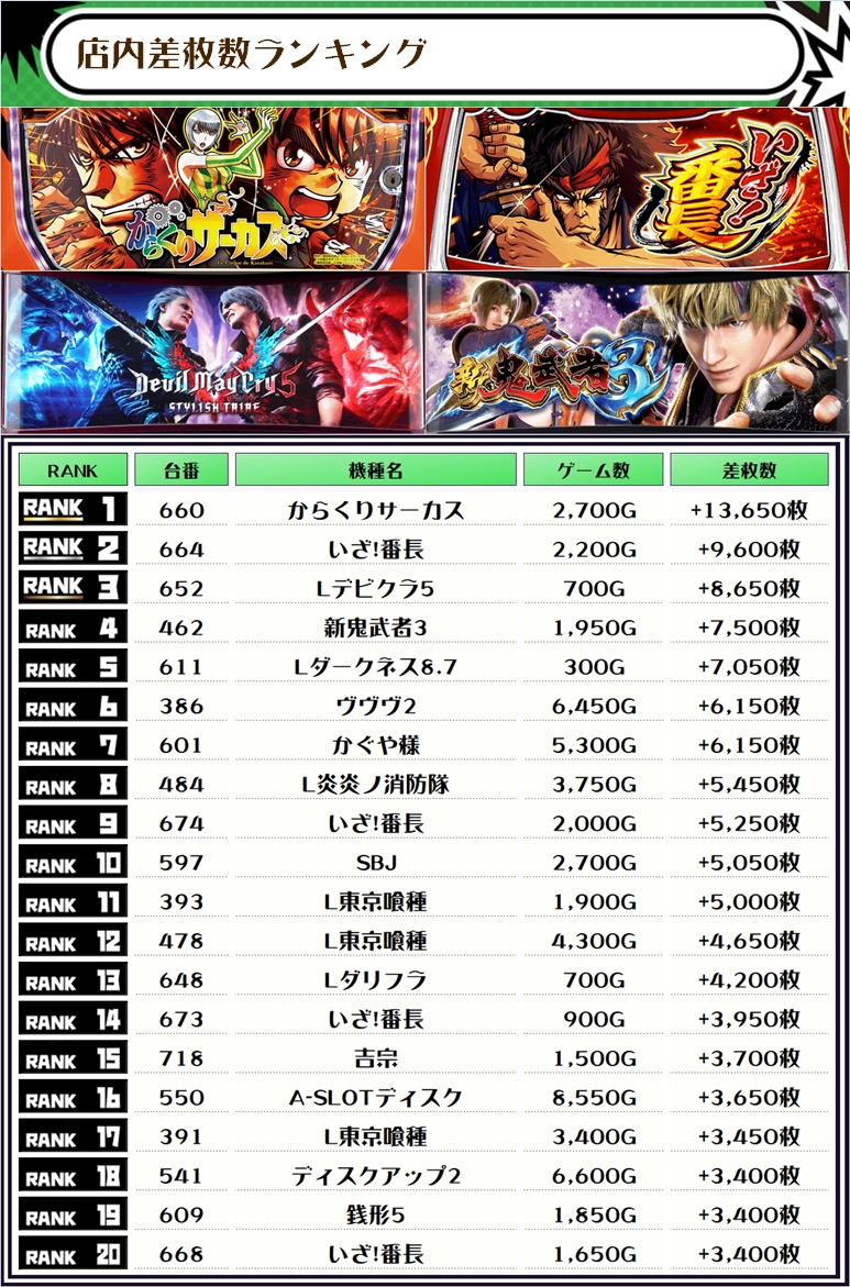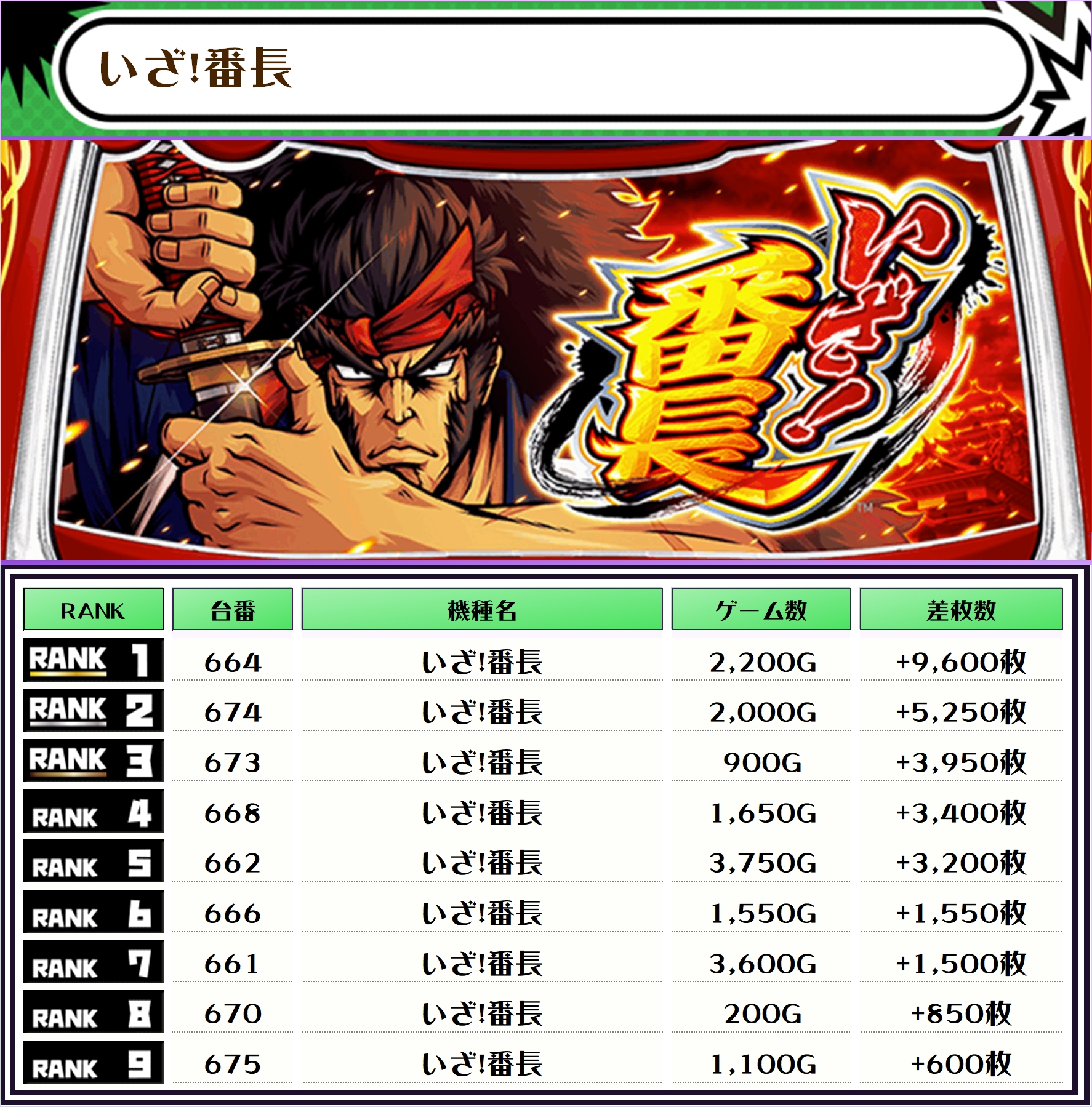 2位には【いざ!番長・664番台】の+9,600枚、3位には【Lデビクラ5・652番台】の+8,650枚がランクインしました📷