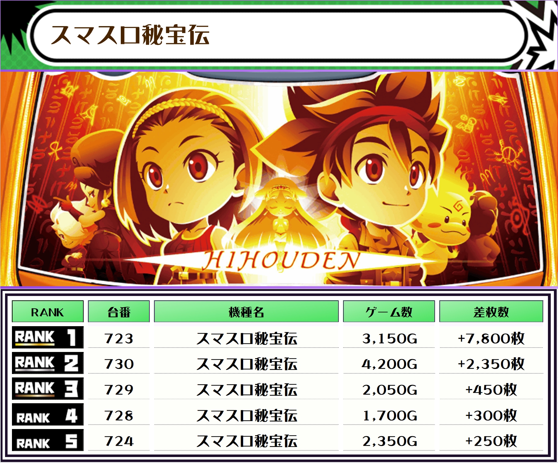 2位には【スマスロ秘宝伝・723番台】の+7,800枚、そして3位には【吉宗・711番台】の+7,400枚がランクインしました📷