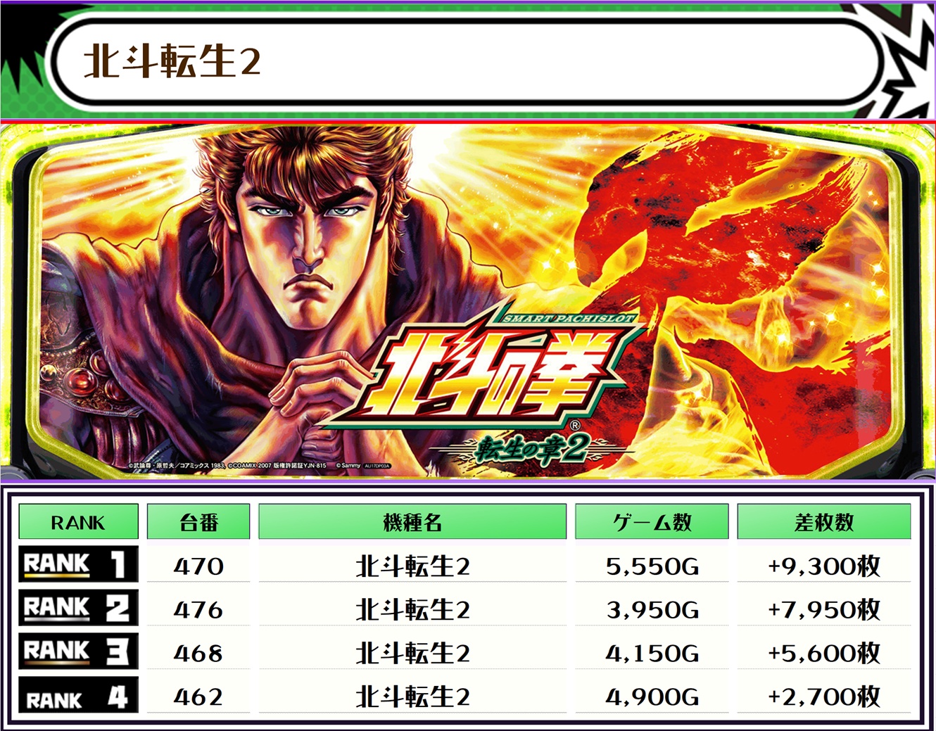2位にも【北斗転生2・476番台】の+7,950枚、そして3位にも【北斗転生2・468番台】の+5,600枚がランクインしました📷なんと、北斗転生2がTOP3を独占🎉🎉🎉