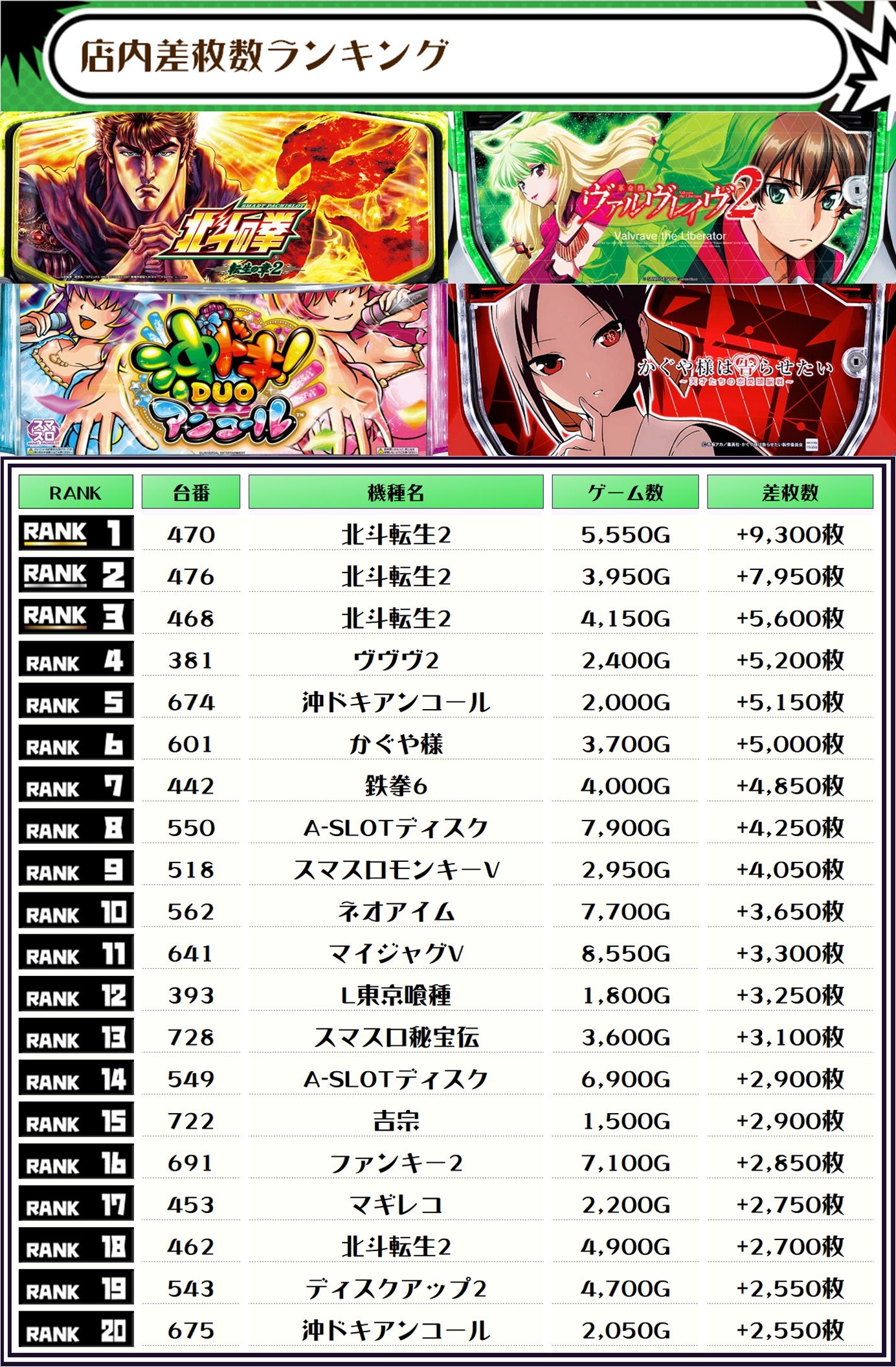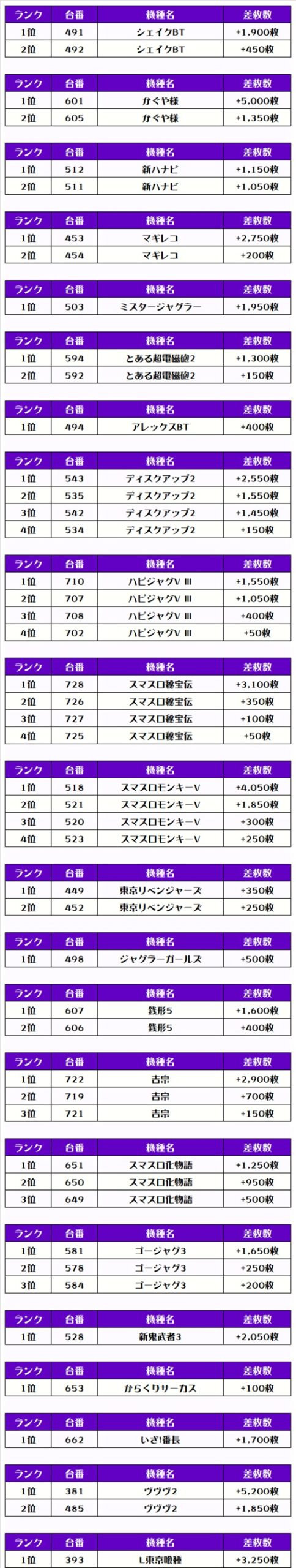 早速、この日の機種別差枚ランキングをチェックしてみましょう!!