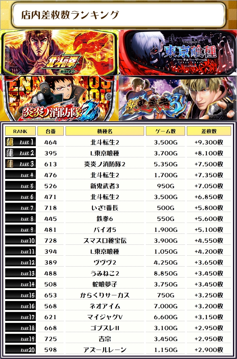 2位には【L東京喰種・395番台】の+8,100枚、そして3位には【炎炎ノ消防隊2・613番台】の+7,500枚がランクインしました✨