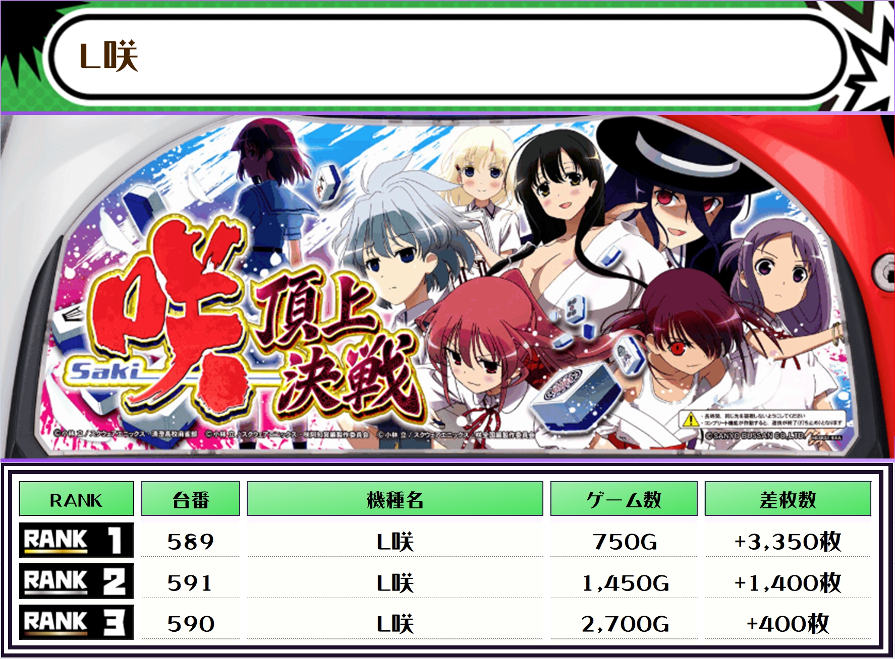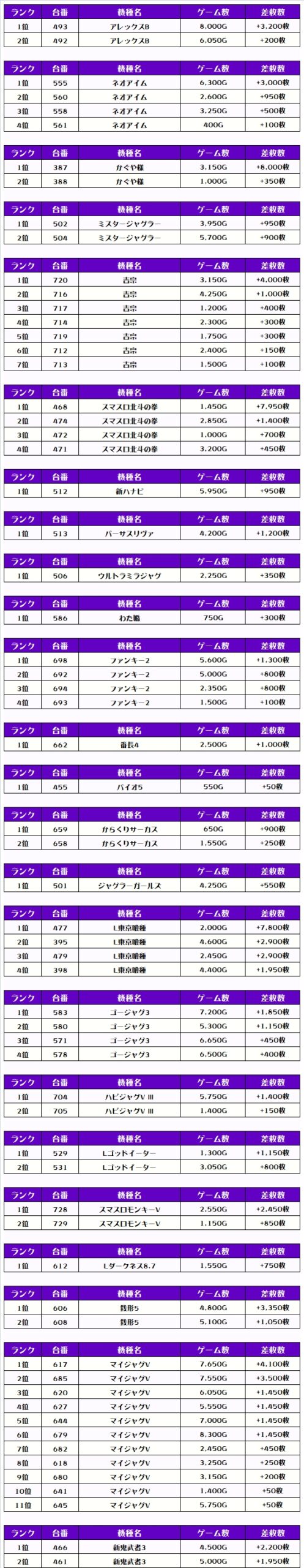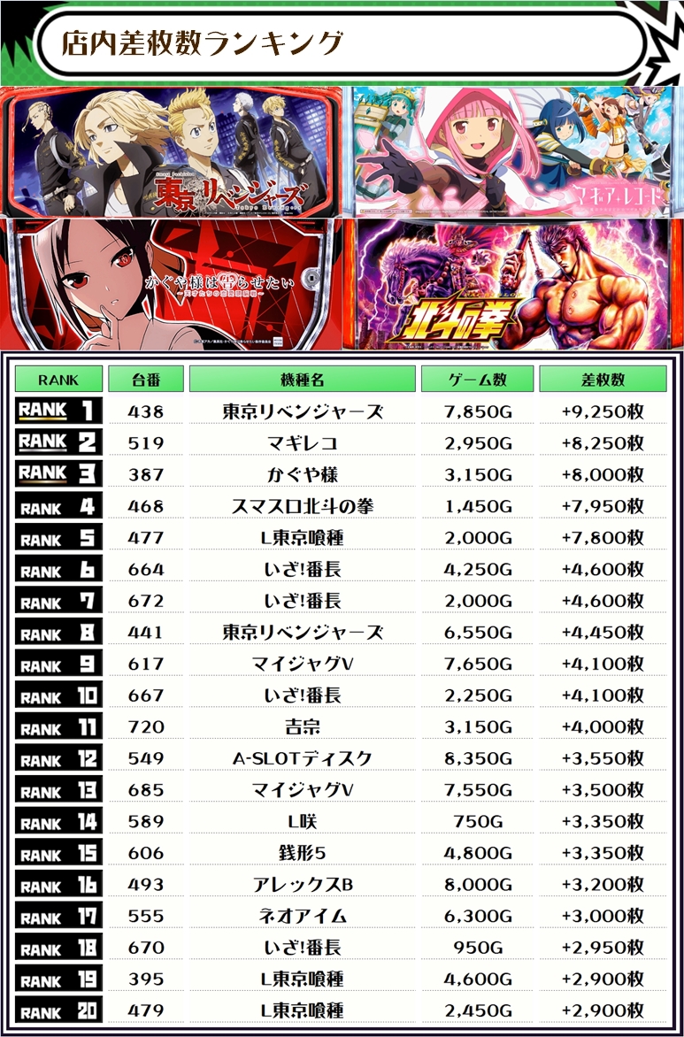 最後に、この日の店内差枚ランキングをご覧ください