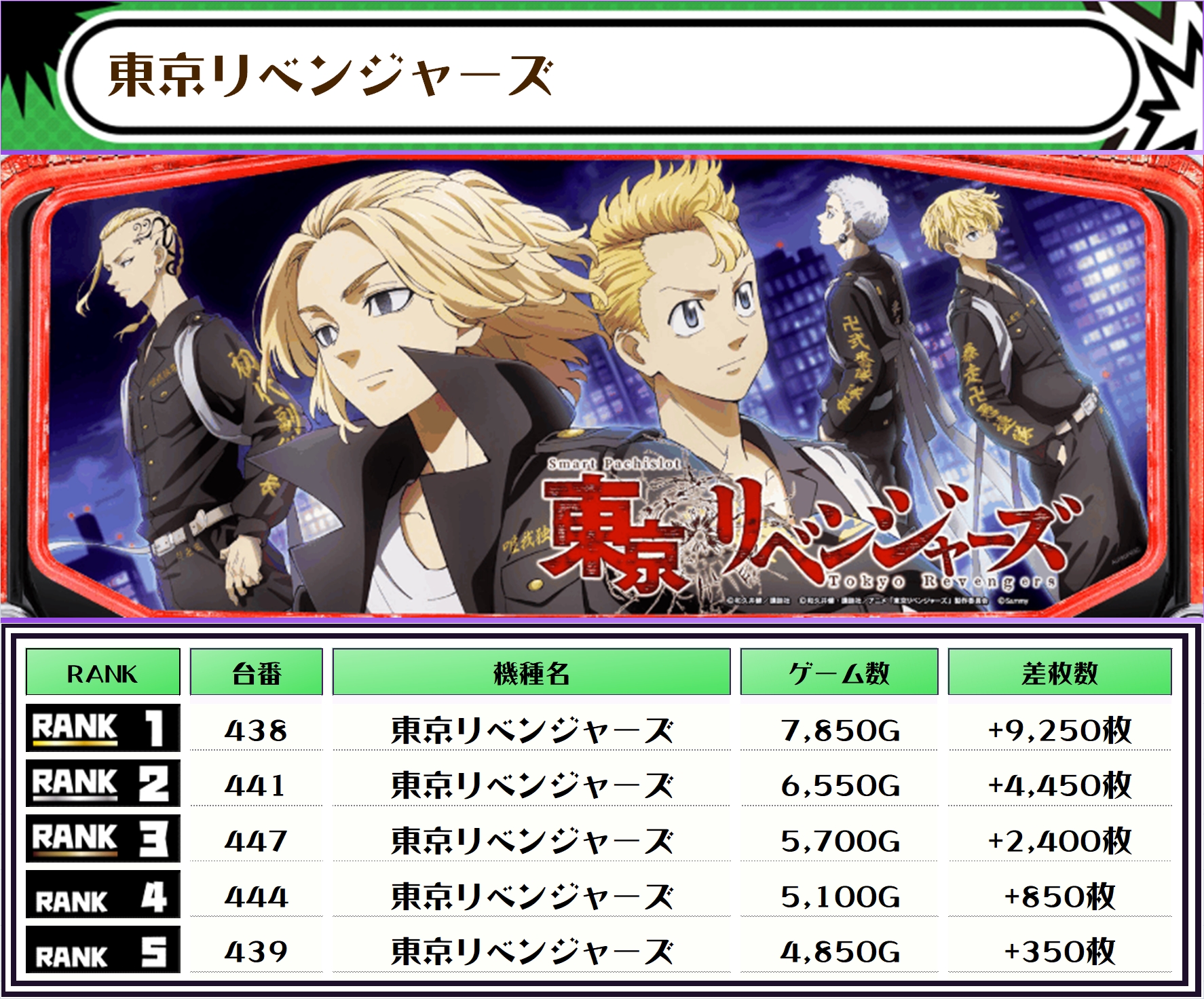 この日、全体の差枚トップに輝いたのは【東京リベンジャーズ・438番台】で+9,250枚‼️