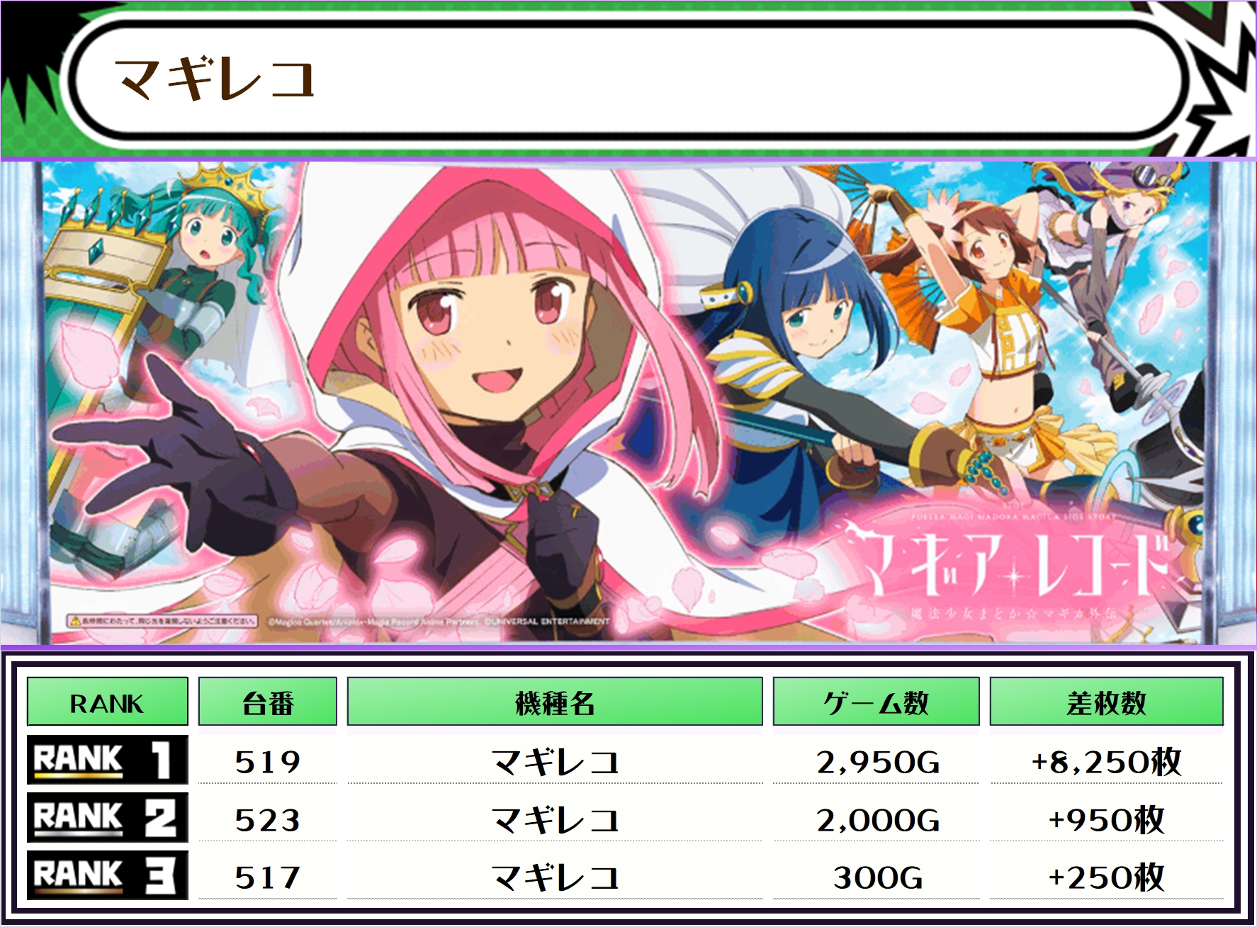 2位には【マギレコ・519番台】の+8,250枚、そして3位には【かぐや様・387番台】の+8,000枚がランクインっ🏆🏆🏆🏆
