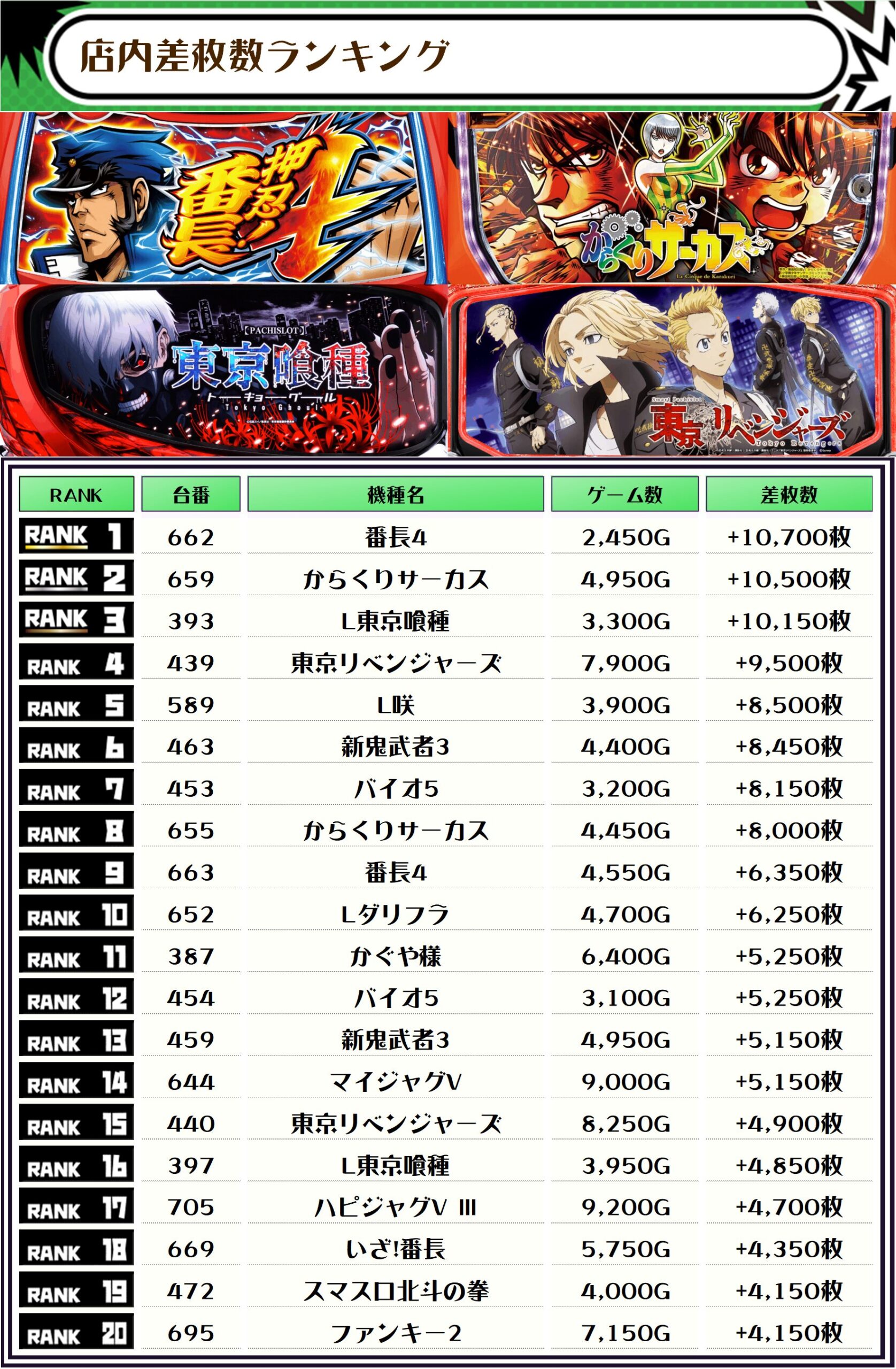 2位には【からくりサーカス・659番台】の+10,500枚、そして3位には【L東京喰種・393番台】の+10,150枚がランクインっ🏆🏆🏆🏆