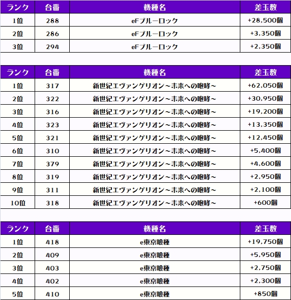そして、ワシが注目した機種の差玉数ランキングを見てもらおう🥴