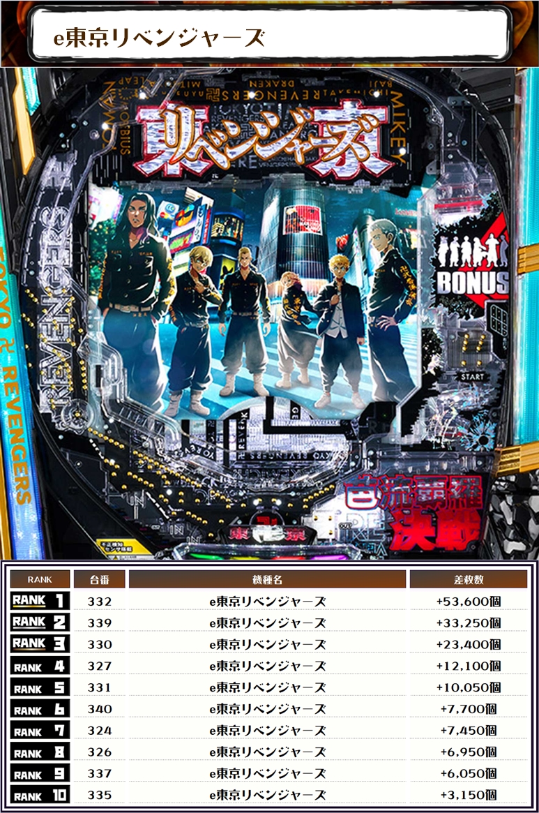 続く2位には【新世紀エヴァンゲリオン~未来への咆哮~・317番台】の+62,050発、そして3位には【e東京リベンジャーズ・332番台】の+53,600発がランクインしたぞっ💪
