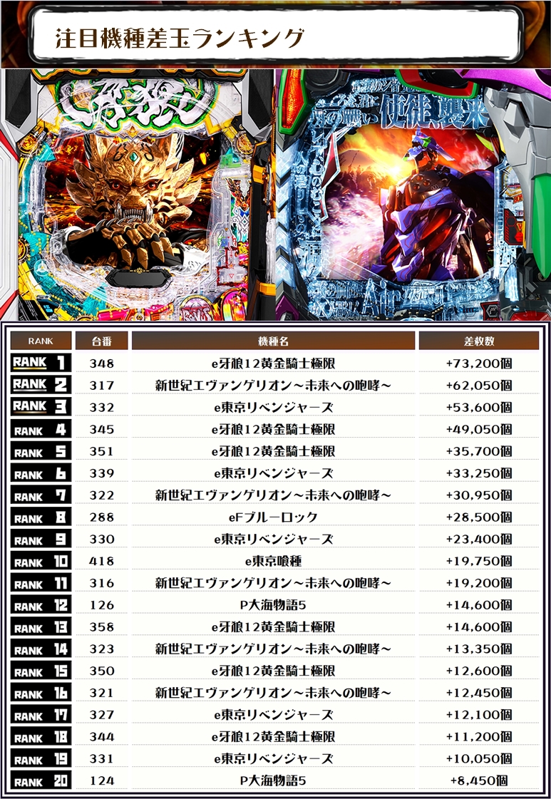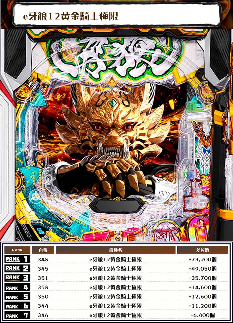 出玉TOPは【e牙狼12黄金騎士極限・348番台】で+73,200発👍