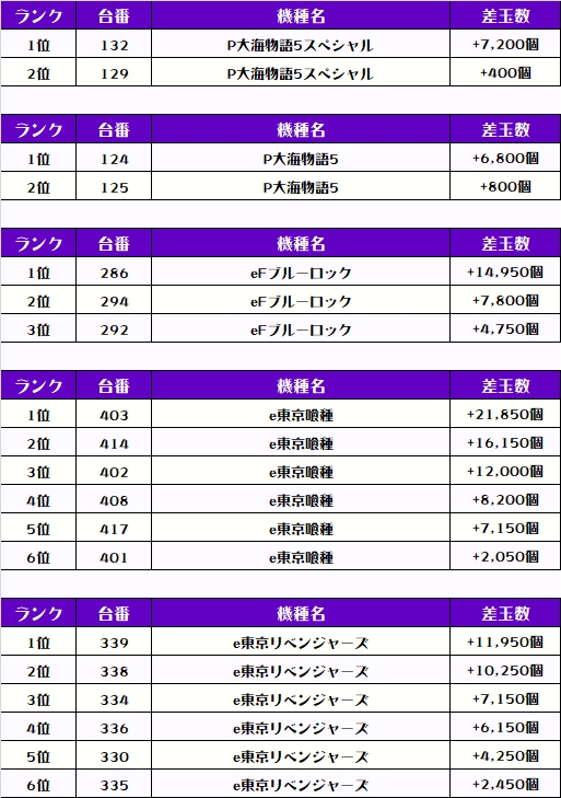 そして、ワシが注目した機種の差玉数ランキングを見てもらおう🥴