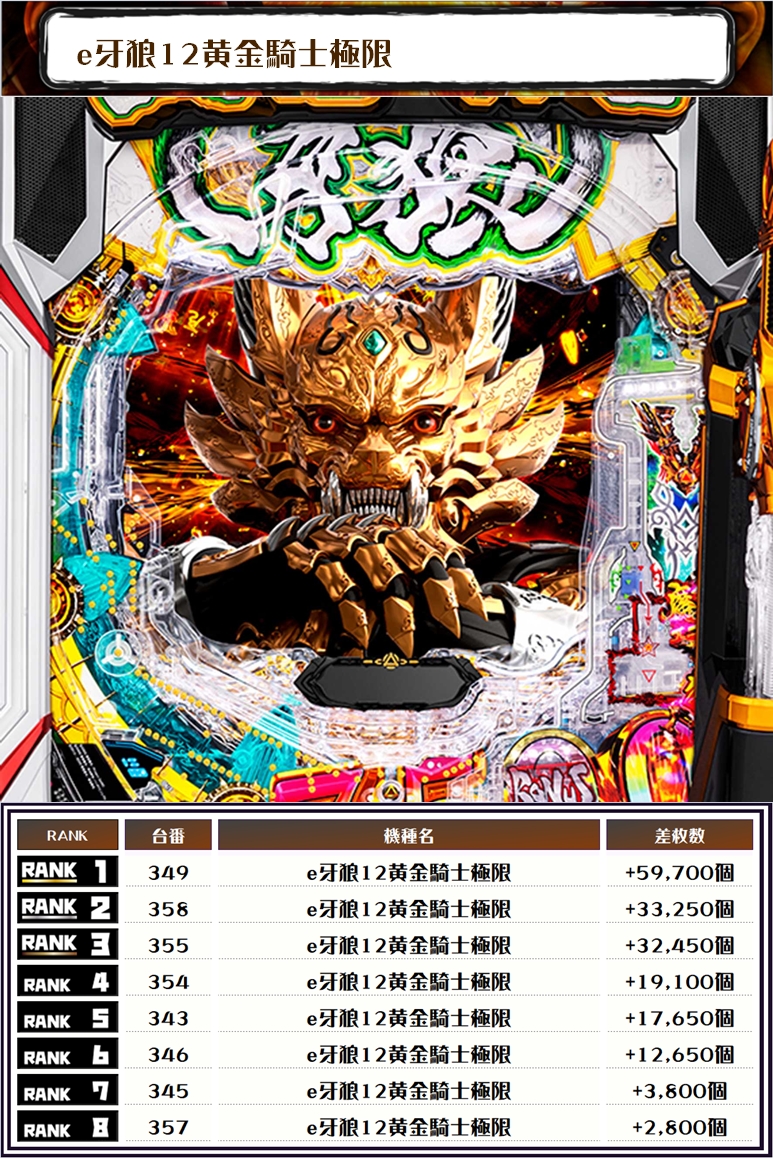 出玉TOPはe牙狼12黄金騎士極限・349番台】で+59,700発👍