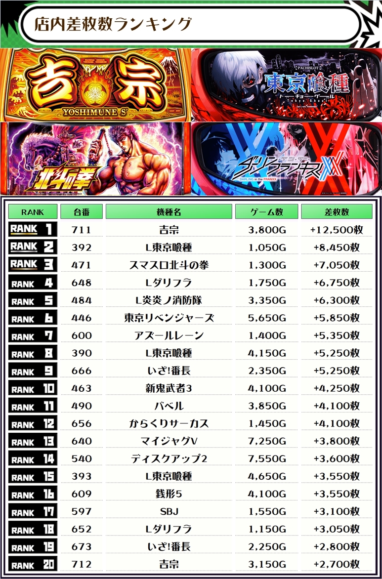 2位には【L東京喰種・392番台】の+8,450枚、そして3位には【スマスロ北斗の拳・471番台】の+7,050枚がランクインっ🏆🏆🏆🏆