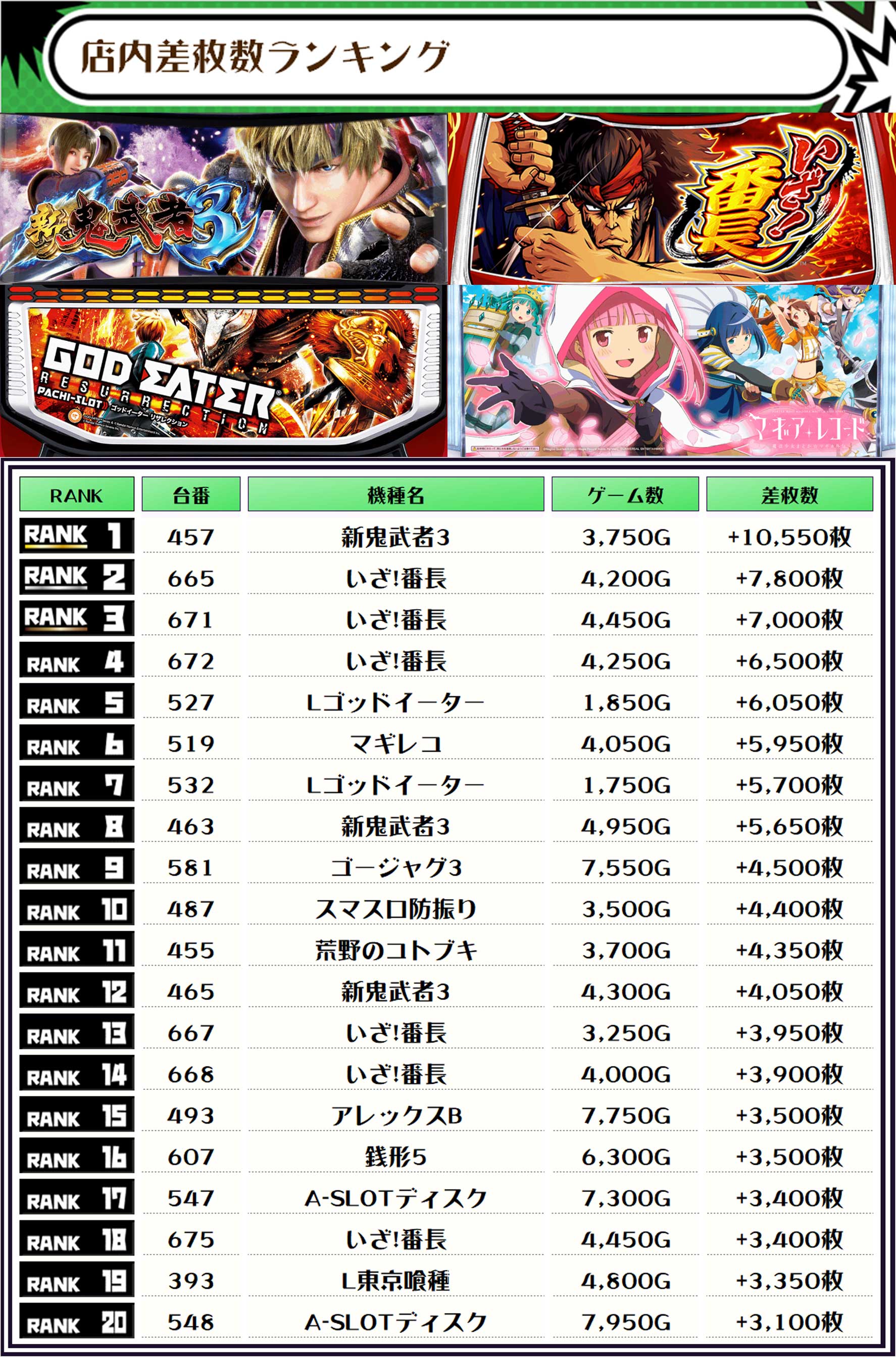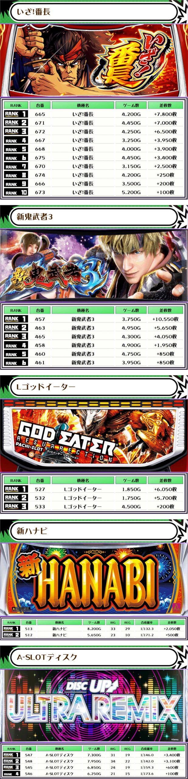 2位には【いざ!番長・665番台】の+7,800枚、そして3位にも同じく【いざ!番長・671番台】の+7,000枚がランクインっ🏆🏆🏆🏆
