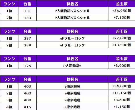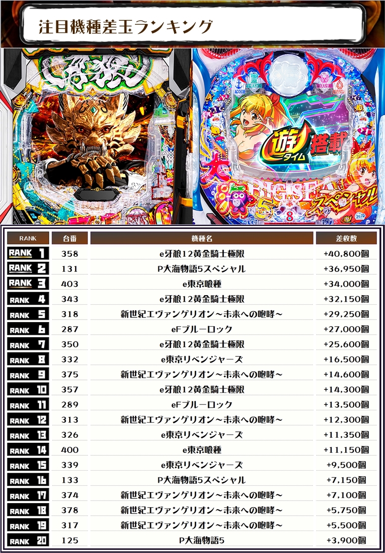 続く2位には【P大海物語5スペシャル・131番台】の+36,950発、そして3位にはe東京喰種・403番台】の+34,000発がランクインしたぞっ💪