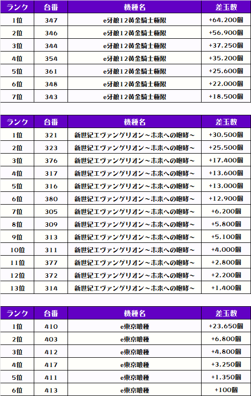 この日のランキングは、e牙狼12黄金騎士極限が昨日に引き続き出玉ランキングTOP&TOP3を独占じゃ!!