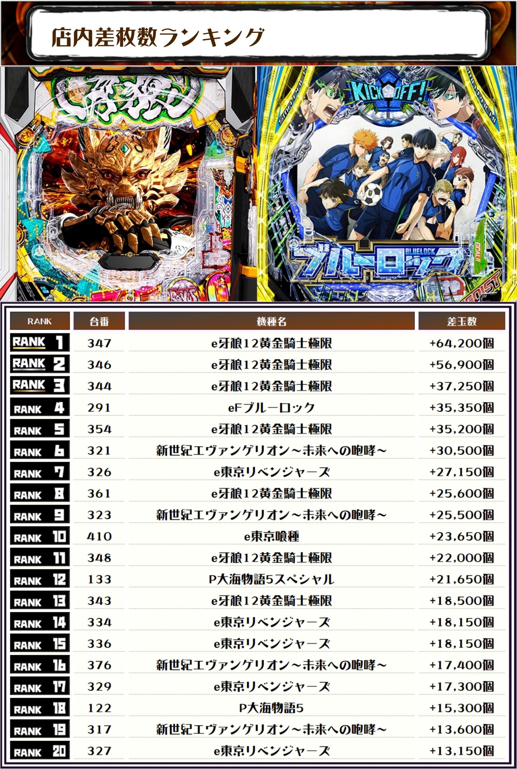 続く2位には【e牙狼12黄金騎士極限・346番台】の+56,900発、そして3位には【e牙狼12黄金騎士極限・344番台】の+37,250発がランクインしたぞっ💪