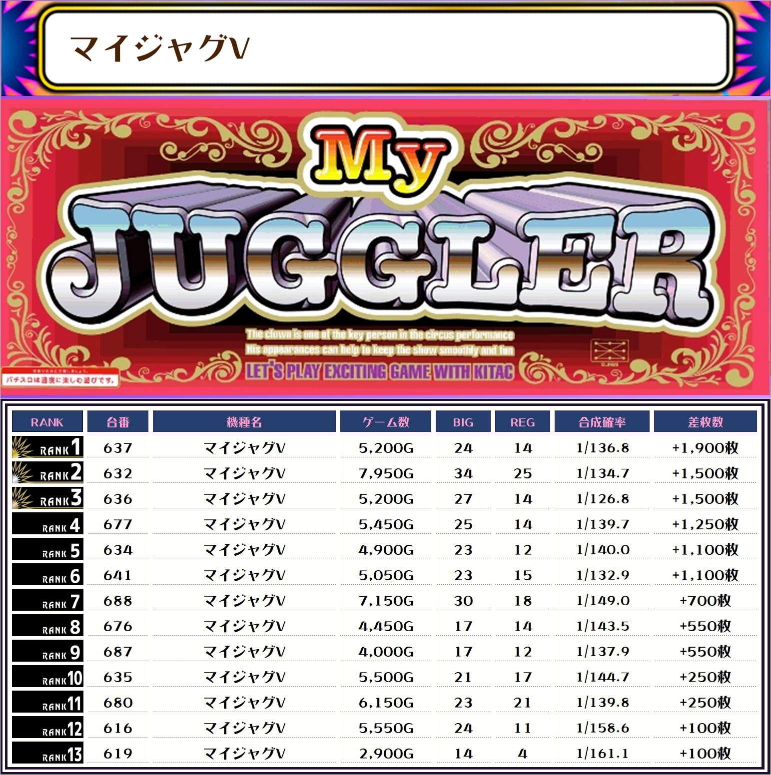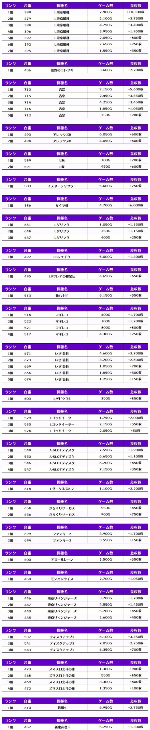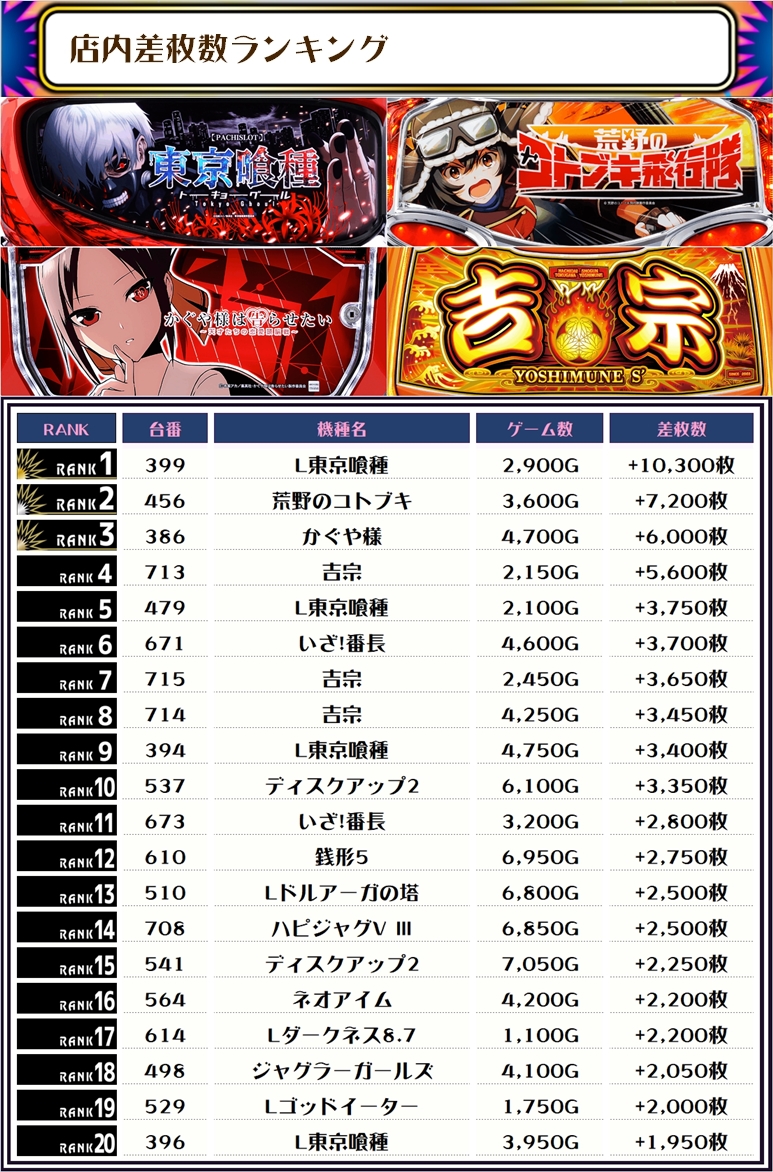 ちなみに、この取材では複数台設置の全機種および全体差枚トップ20ランキング形式でお伝えしていきます!!