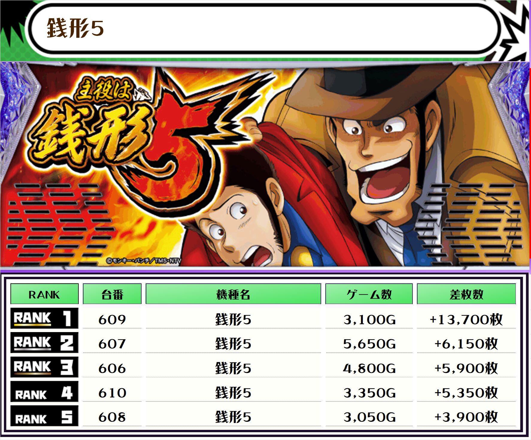 この日の全体差枚トップは【銭形5・609番台】の+13,700枚っ🎉
