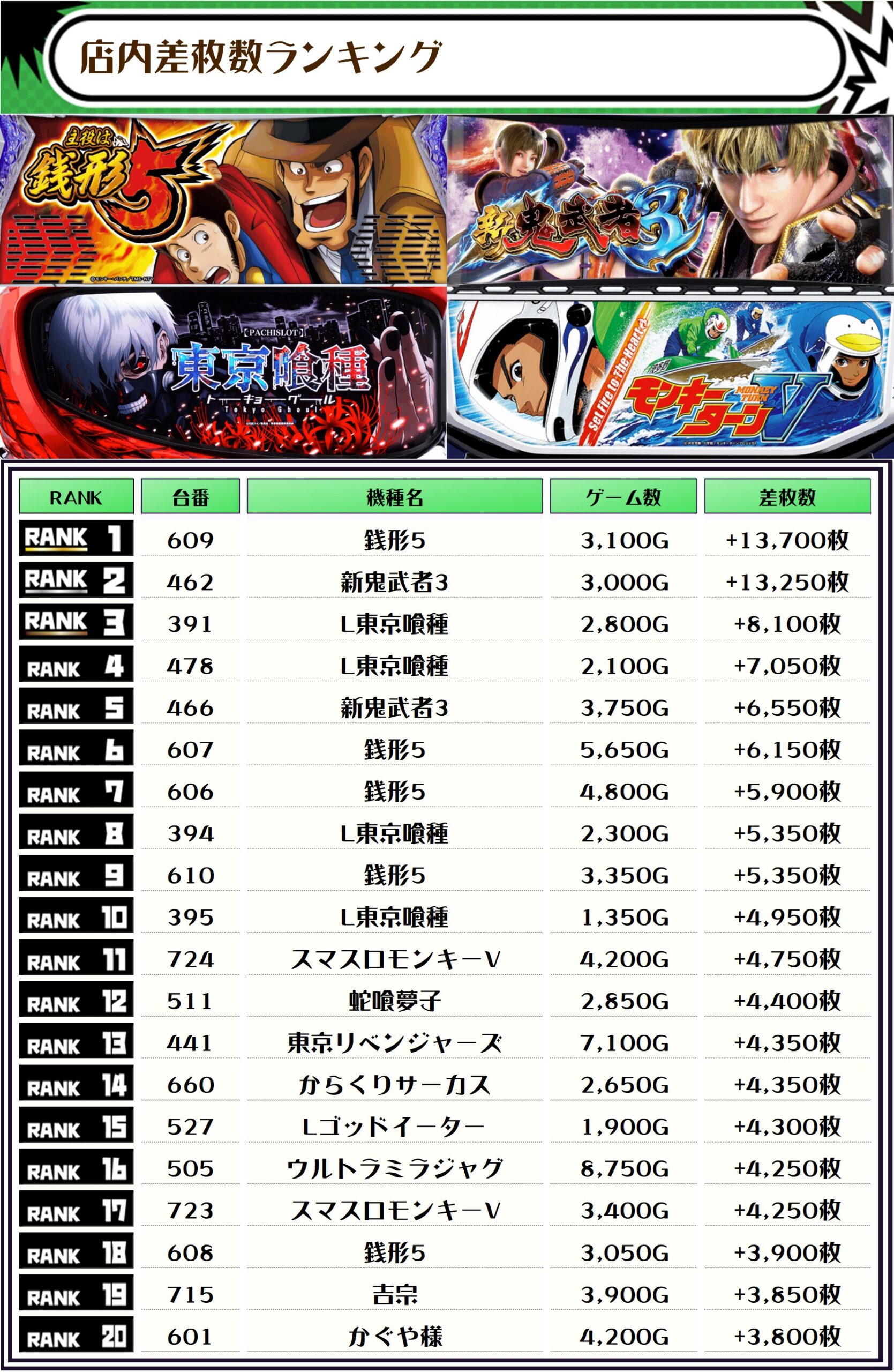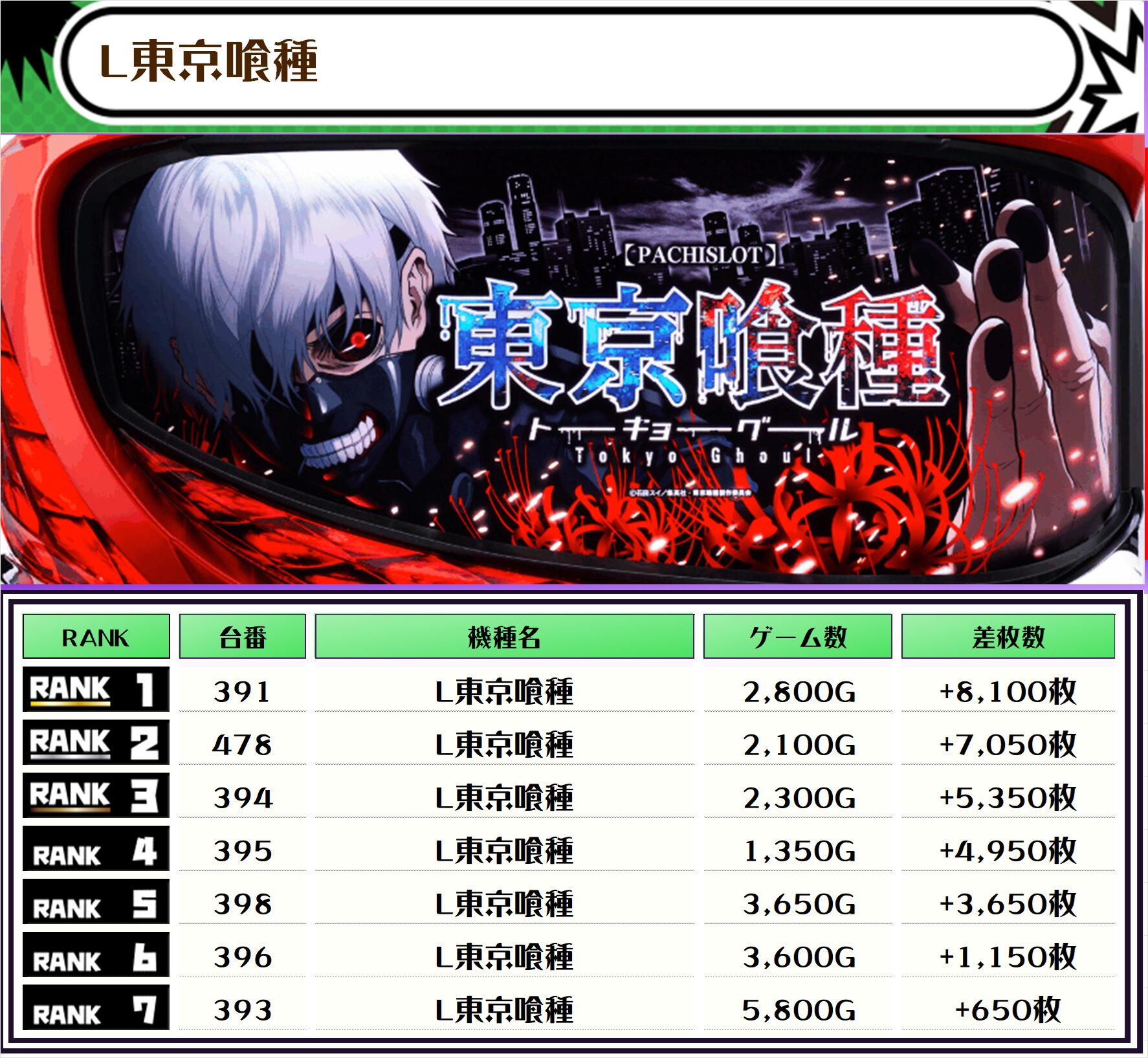 2位には【新鬼武者3・462番台】の+13,250枚、3位には【L東京喰種・391番台】の+8,100枚がランクインしました📷