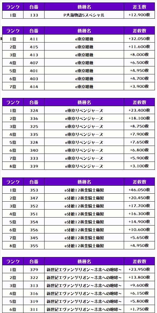 そして、ワシが注目した機種の差玉数ランキングを見てもらおう🥴