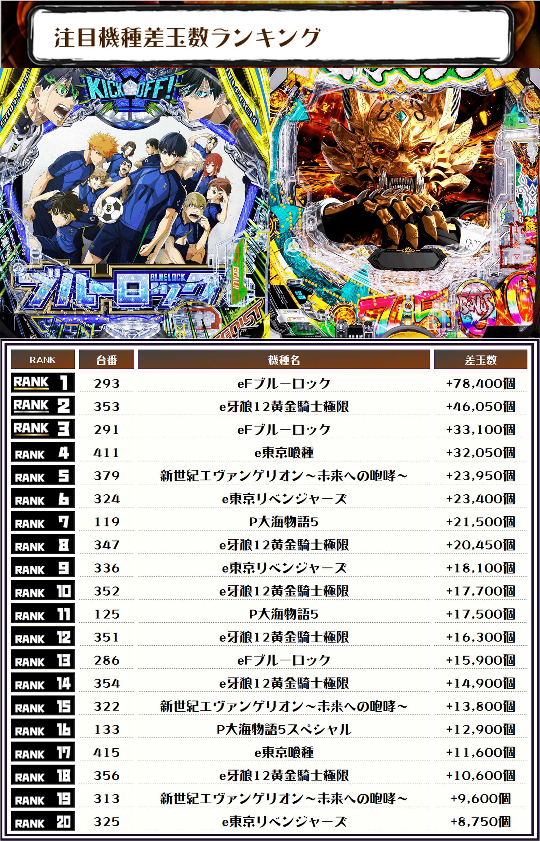 続く2位には【e牙狼12黄金騎士極限・353番台】の+46,050発、そして3位には【eFブルーロック・291番台】の+33,100発がランクインしたぞっ💪