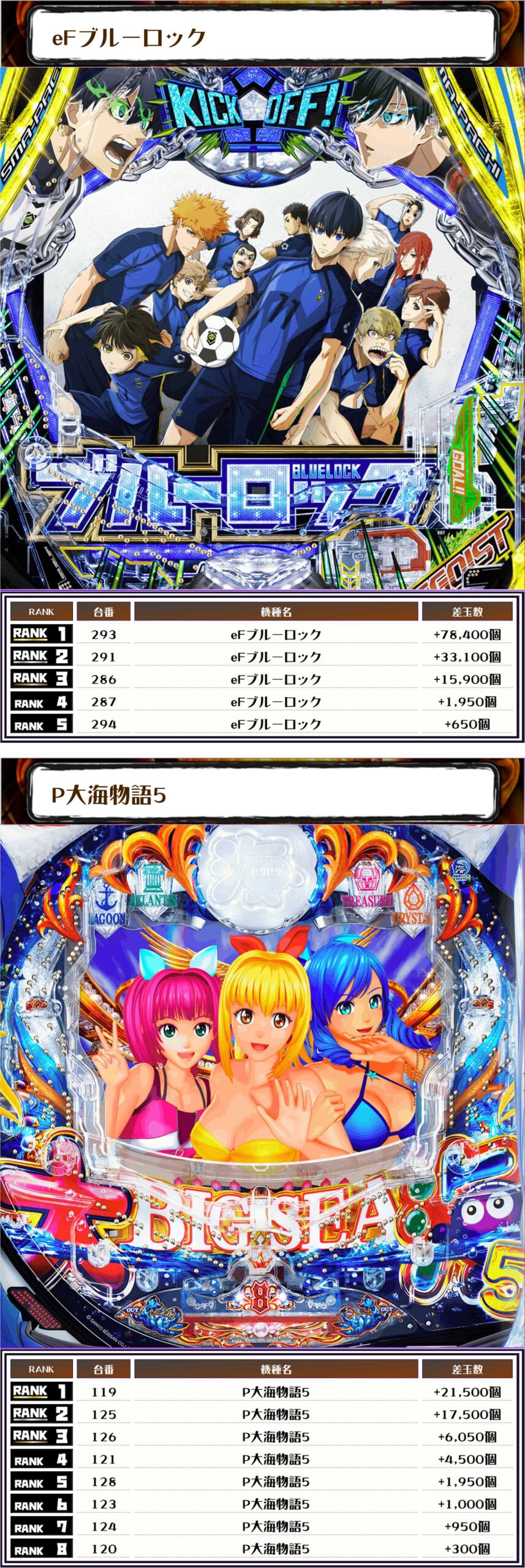 出玉TOPは【eFブルーロック・293番台】で+78,400発👍