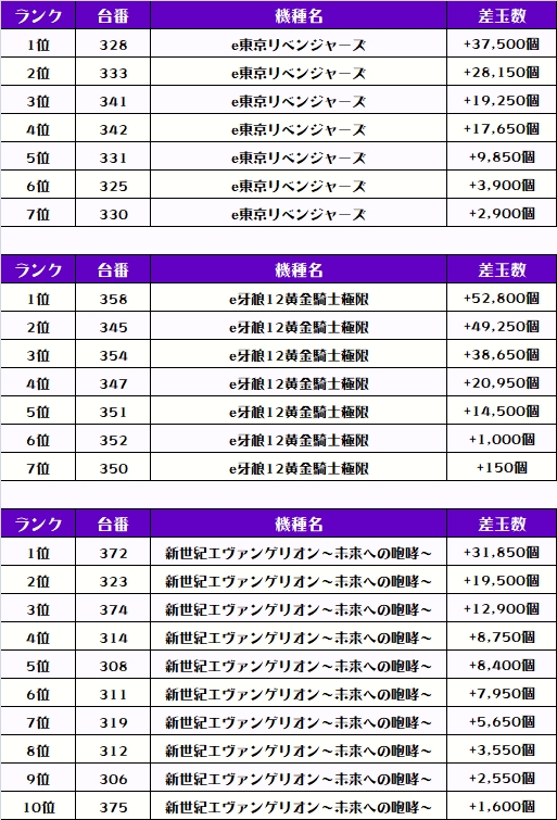 続く2位にはe牙狼12黄金騎士極限・358番台】の+52,800発、そして3位には同じくe牙狼12黄金騎士極限・345番台】の+49,250発がランクインしたぞっ💪