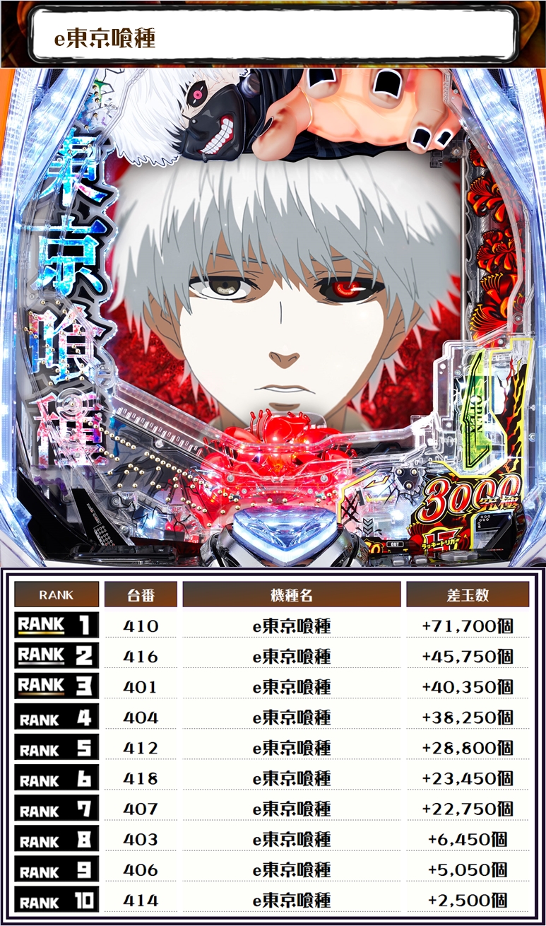 出玉TOPはe東京喰種・410番台】で+71,700発👍