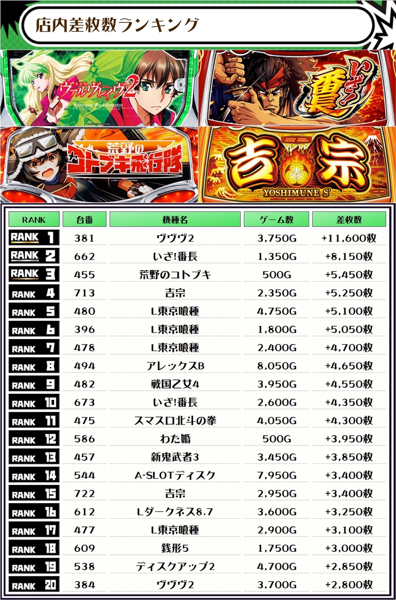 ちなみに、この取材では複数台設置の全機種および全体差枚トップ20をランキング形式でお伝えしていきます‼️