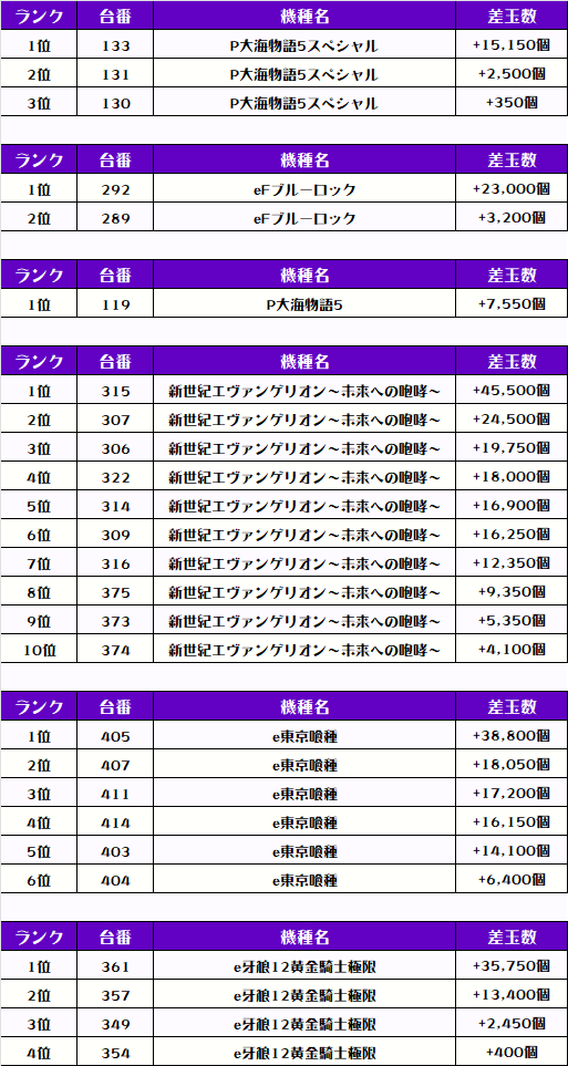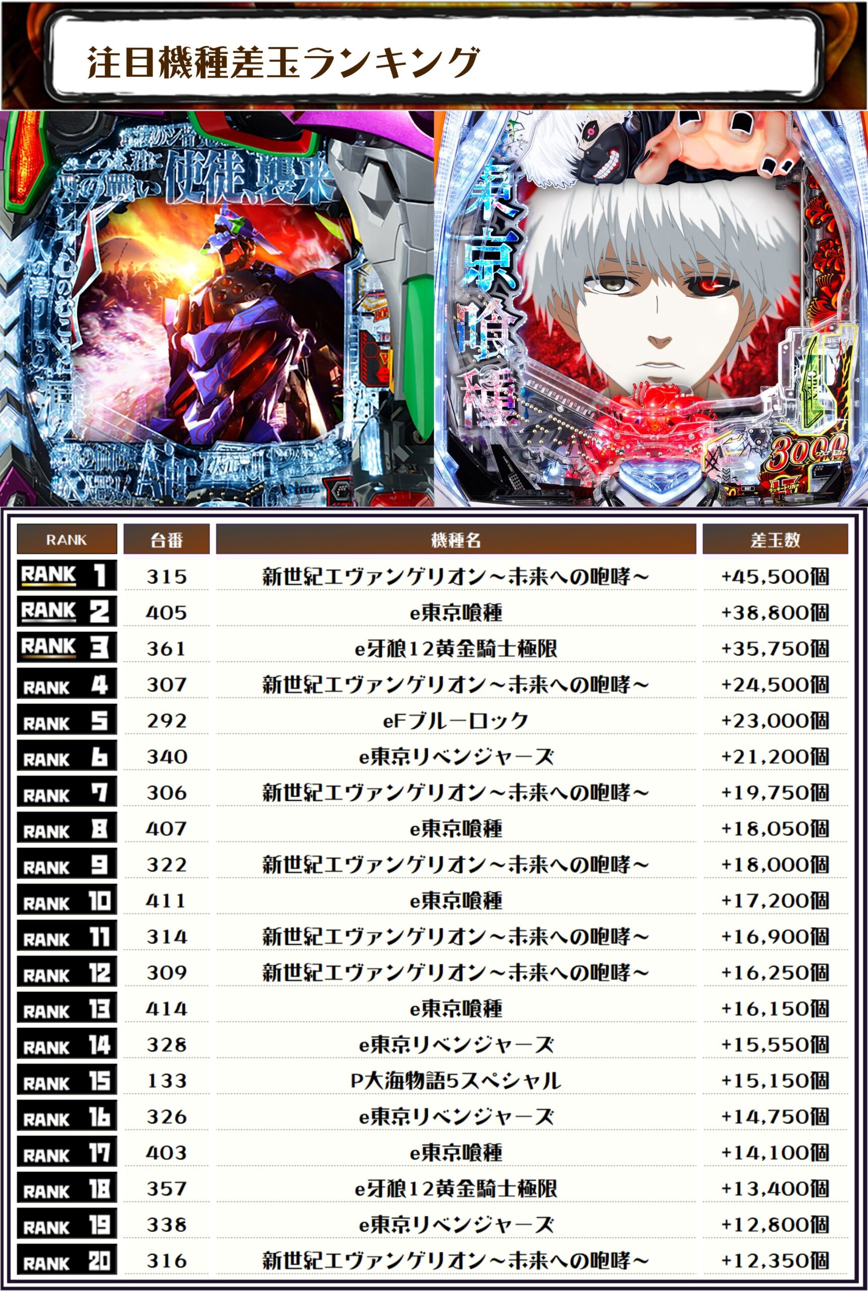 続く2位には同じく【e東京喰種・405番台】の+38,800発、そして3位には【e牙狼黄金騎士極限・316番台】の+35,750発がランクインしたぞっ💪