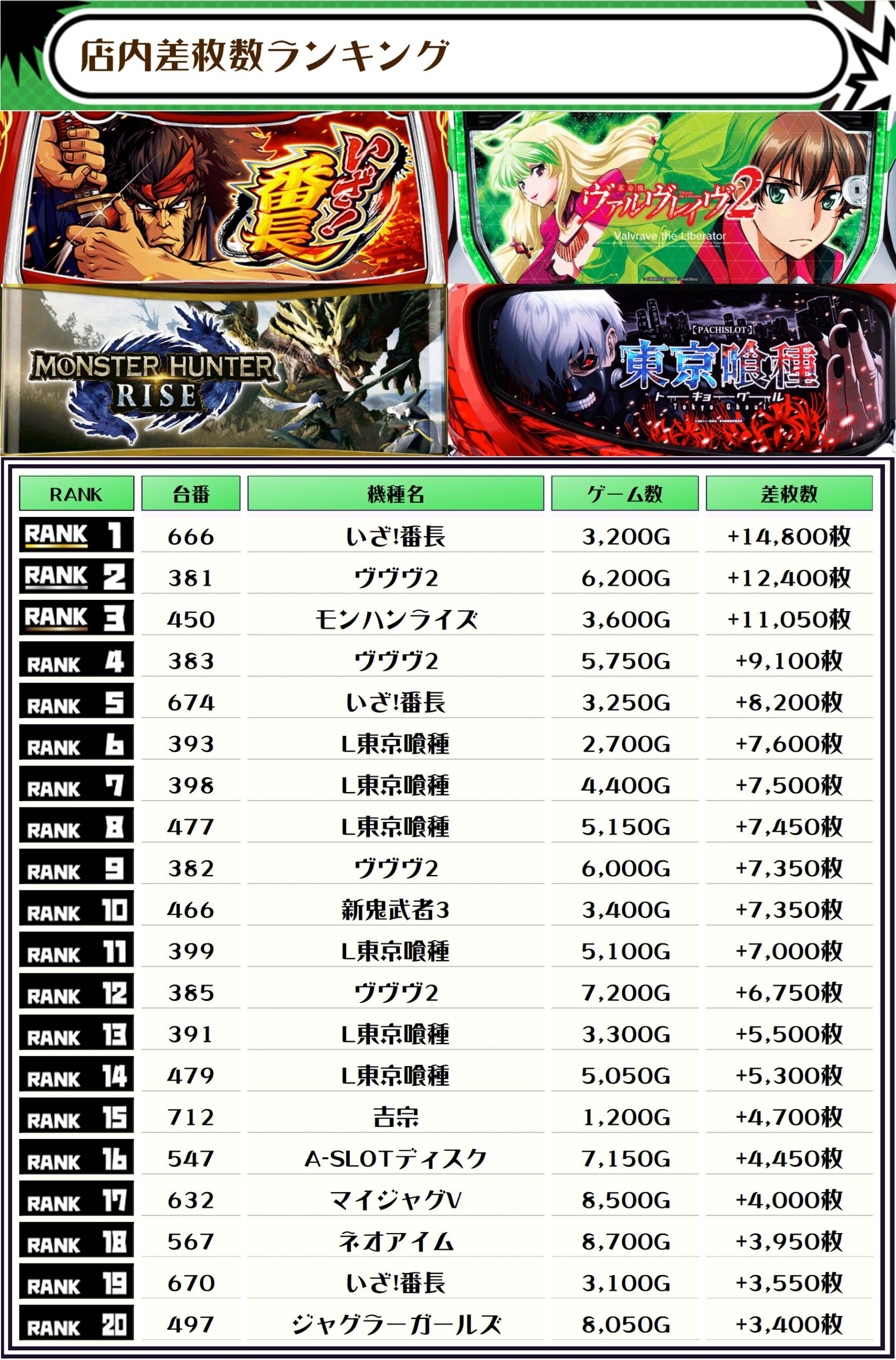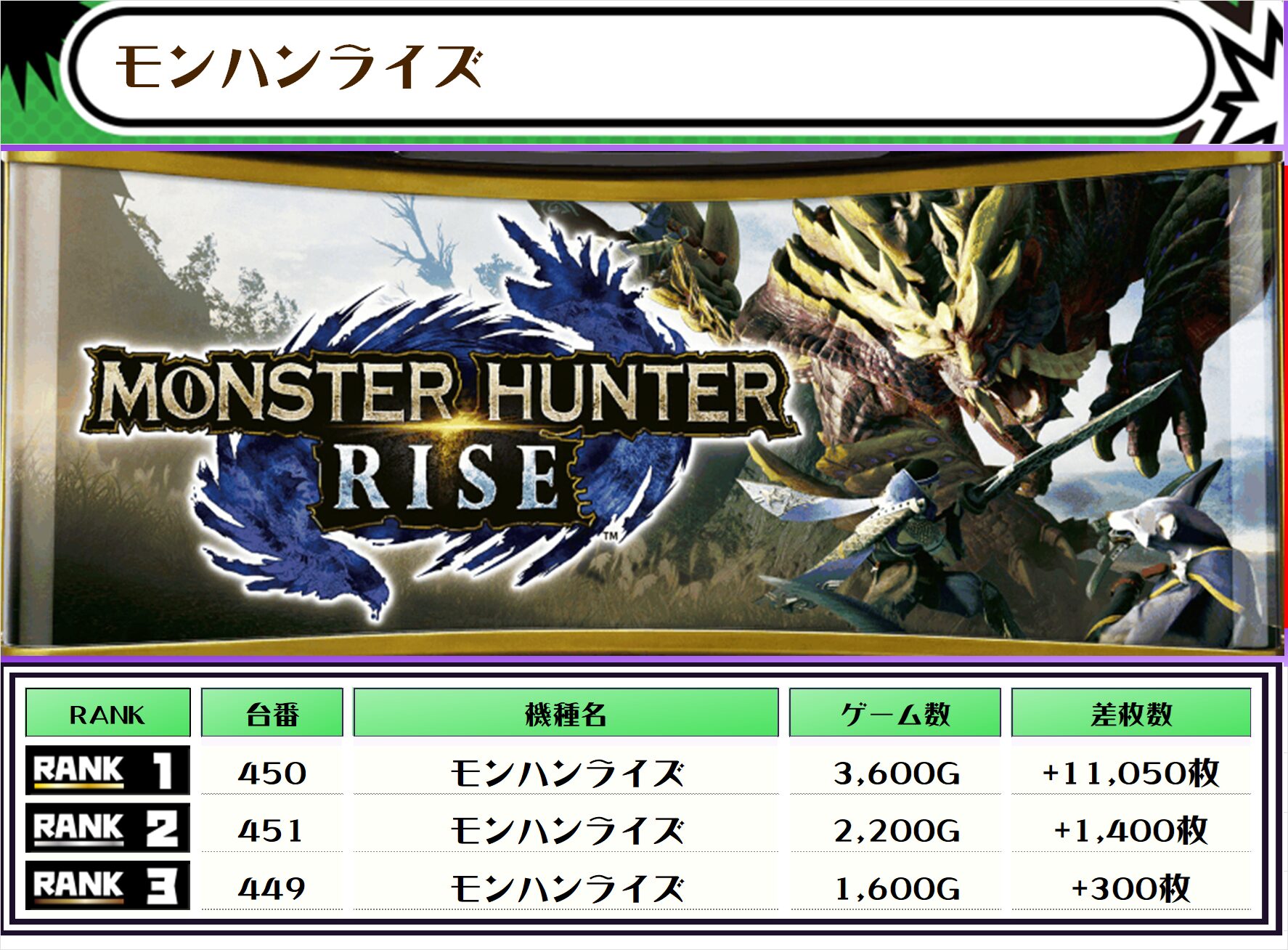 2位には【ヴヴヴ2・381番台】の+12,400枚、3位には【モンハンライズ・450番台】の+11,050枚がランクインしました📷