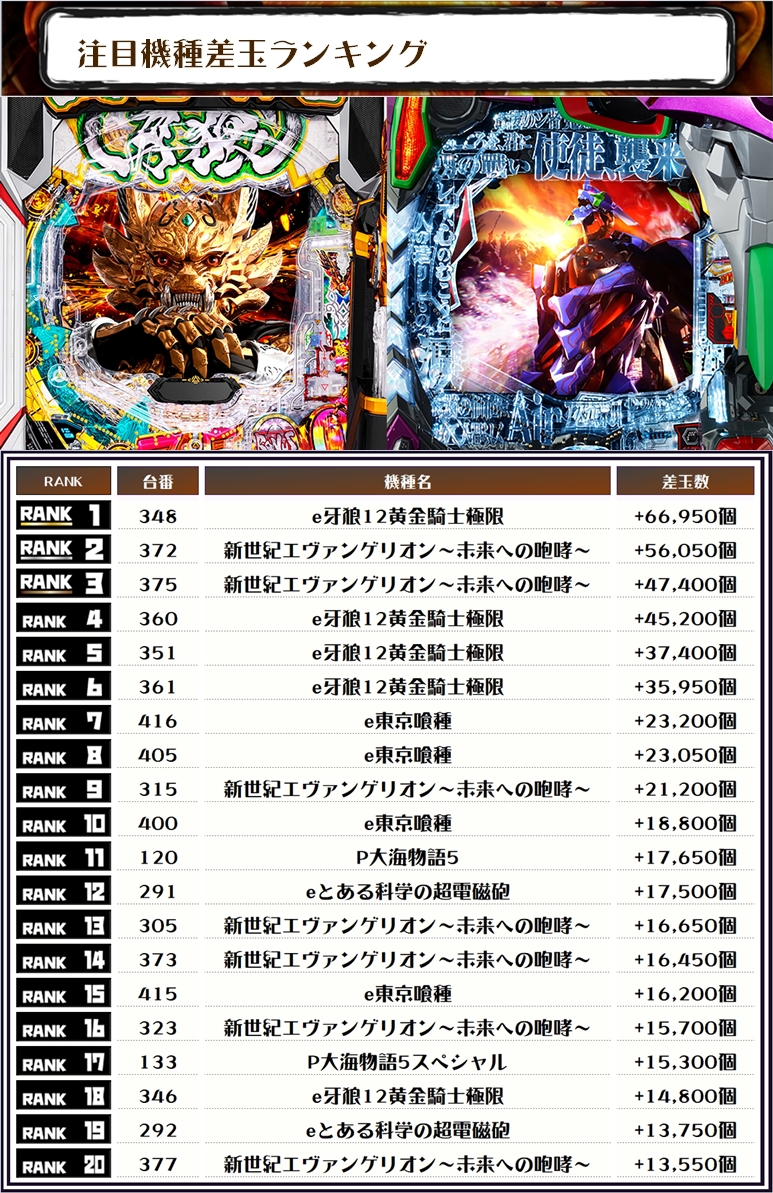 続く2位には【新世紀エヴァンゲリオン未来への咆哮・372番台】の+56,050発、そして3位には同じく新世紀エヴァンゲリオン未来への咆哮・375番台】の+47,400発がランクインしたぞっ💪