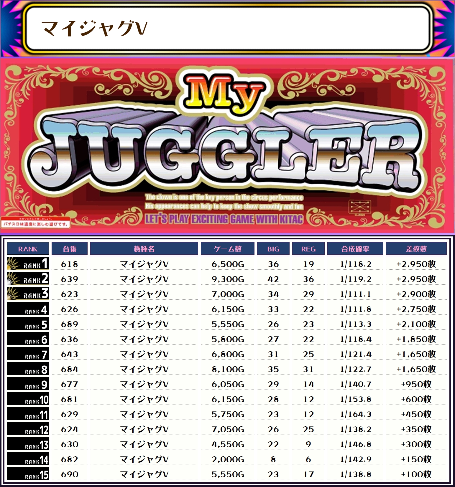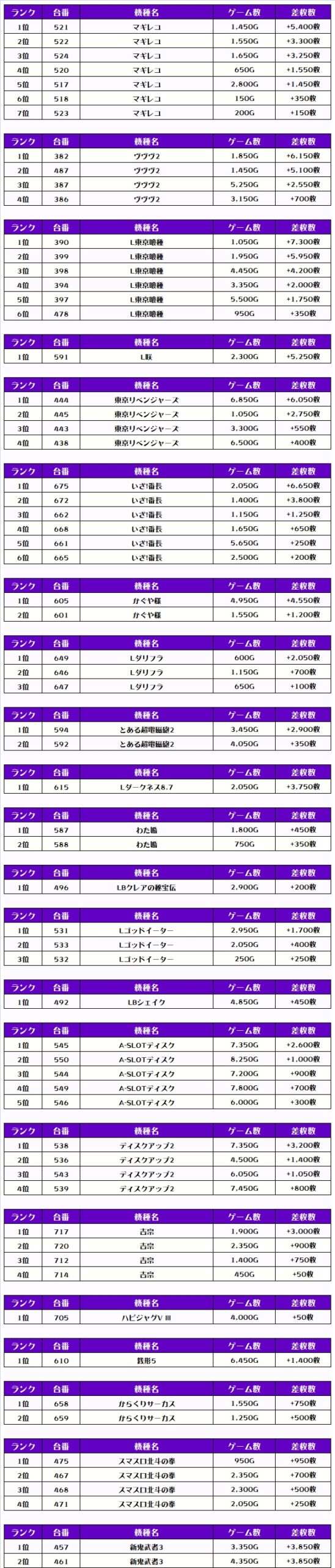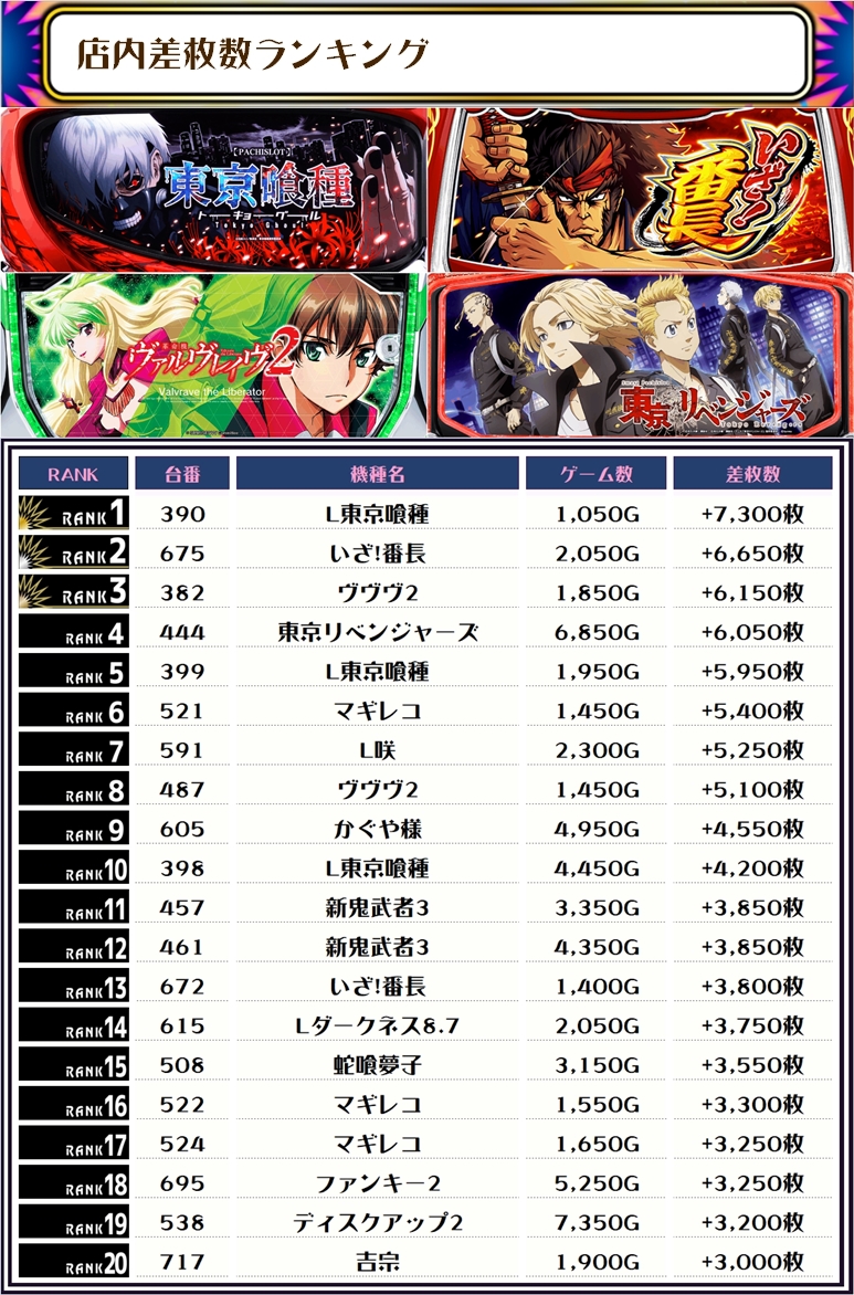 2位には【いざ!番長・675番台】の+6,650枚、3位には【ヴヴヴ2・382番台】の+6,150枚がランクインです💥