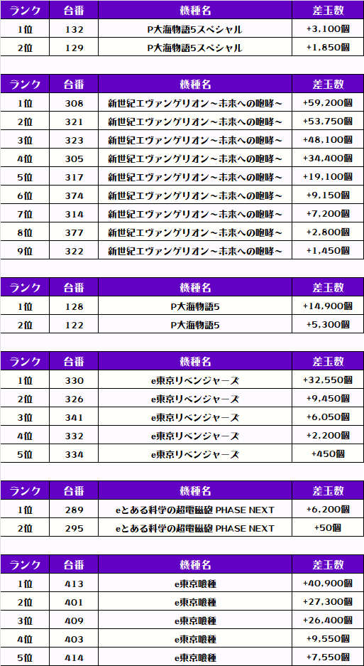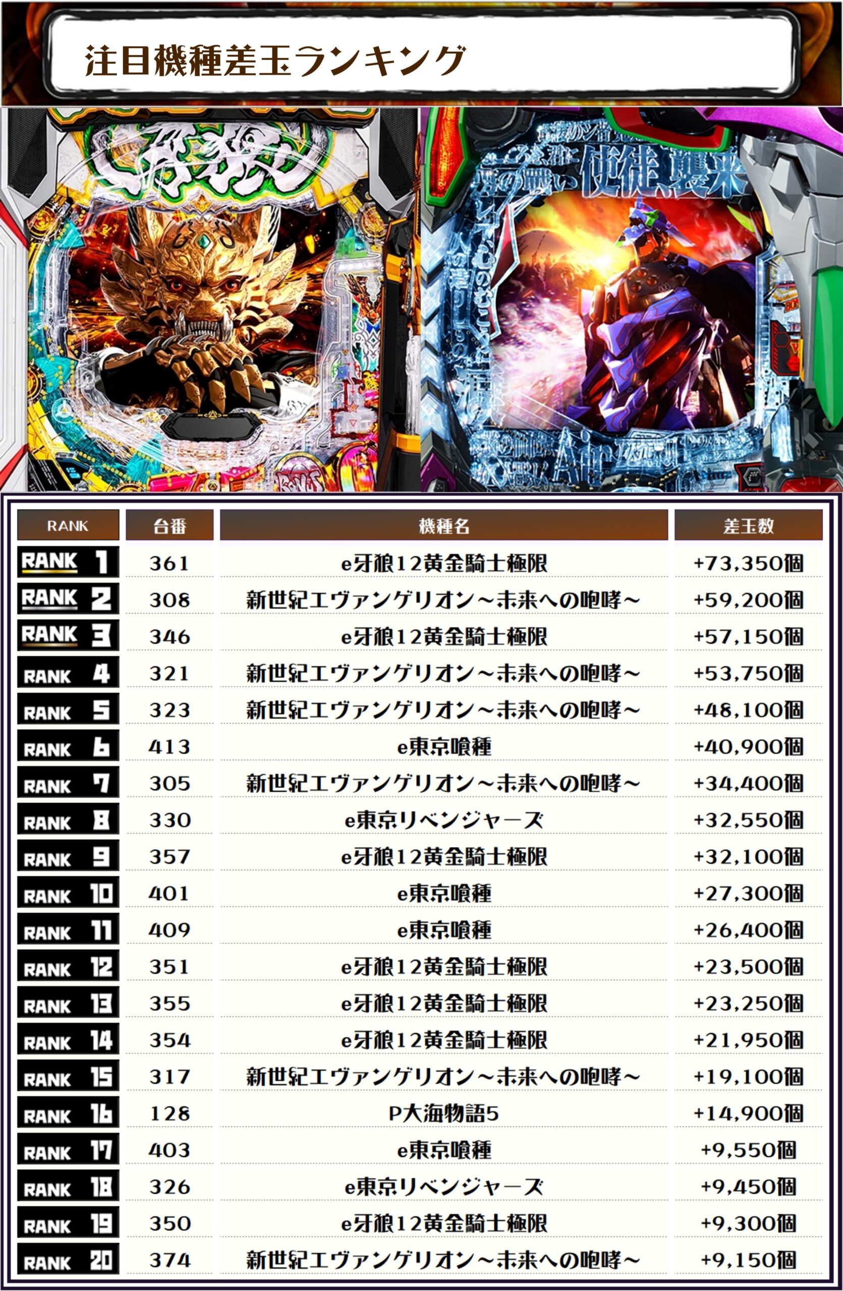 続く2位には【新世紀エヴァンゲリオン~未来への咆哮~・308番台】の+59,200発、そして3位には【e牙狼12黄金騎士極限・346番台】の+57,150発がランクインしたぞっ💪